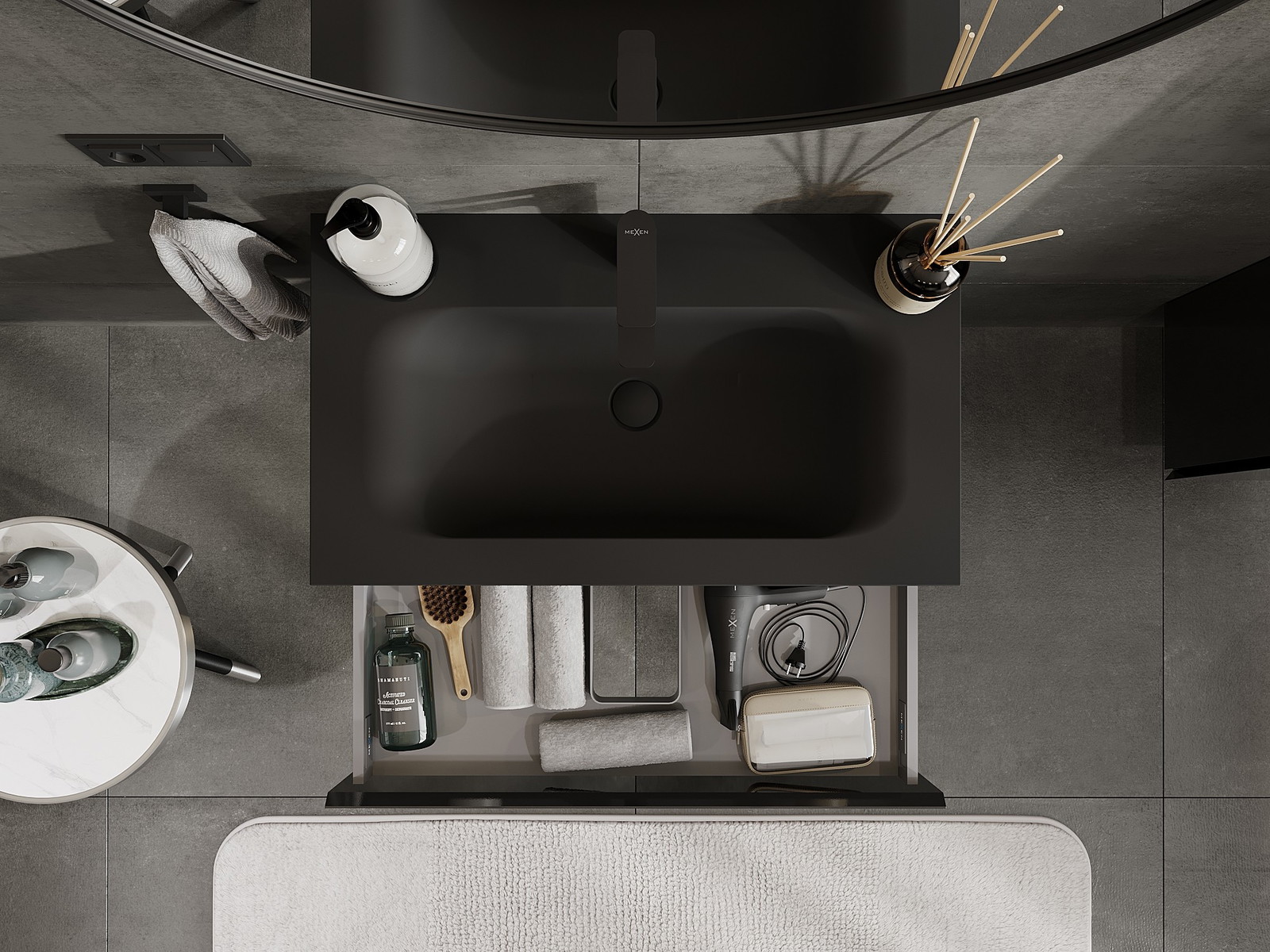 Mexen Orio koupelnová skříňka 80 cm s umyvadlem Vela, 1 zásuvka, černý lesk/černý mat - 91A10-08023-1-BF70-W23M71