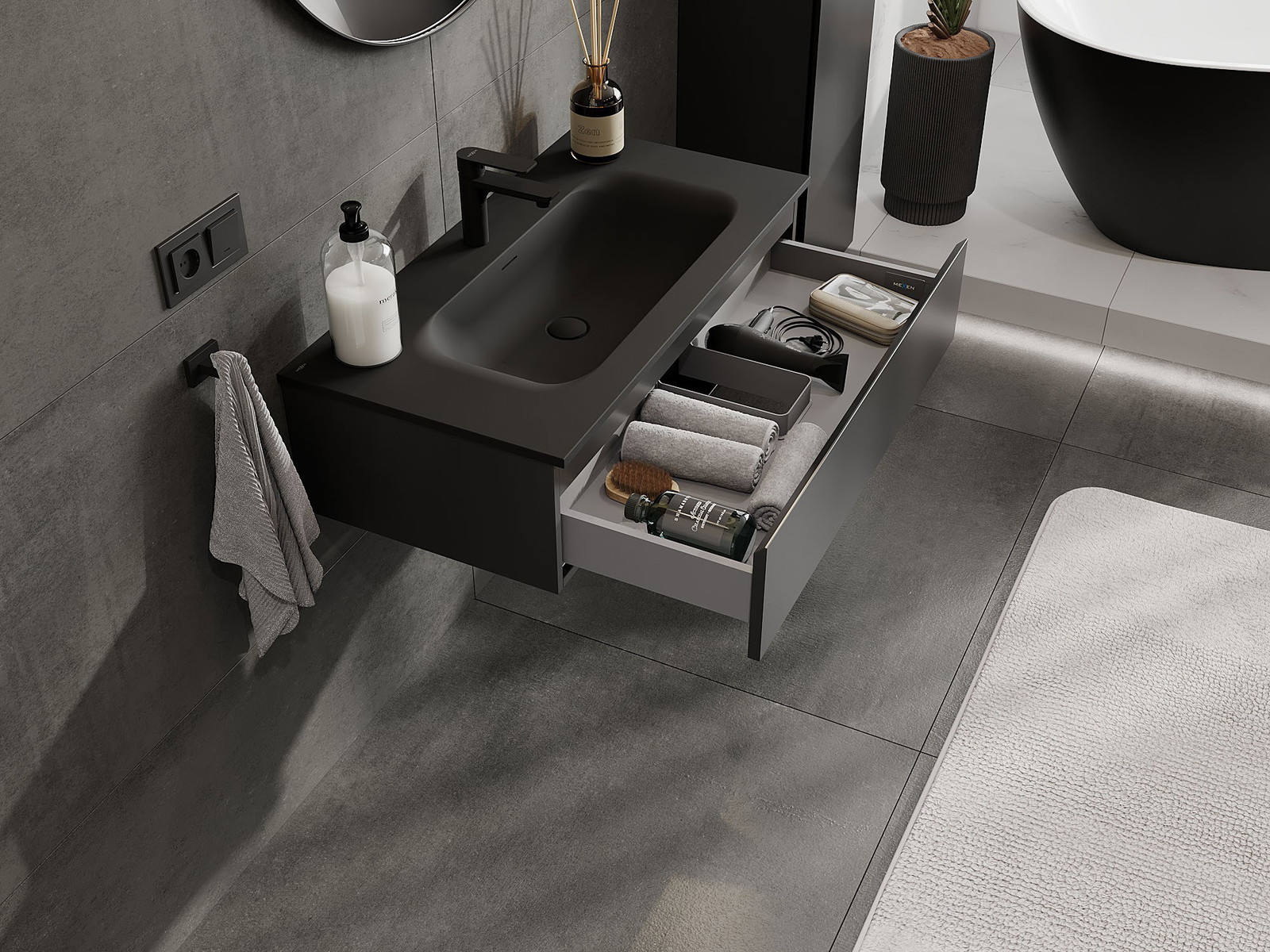 Výřez v zásuvce je navržen tak, aby pojmul sifon, který je nezbytný v instalacích umyvadlových. Díky tomu může být nábytek plně funkčně namontován, aniž by bylo nutné vzdát se prostoru v zásuvce ve prospěch instalace.