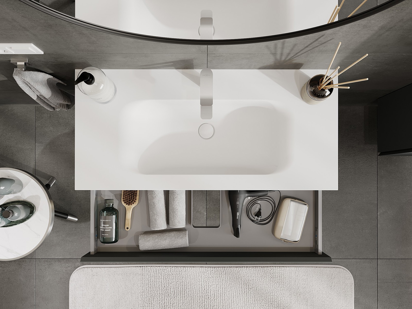Výřez v zásuvce je navržen tak, aby pojmul sifon, který je nezbytný v instalacích umyvadlových. Díky tomu může být nábytek plně funkčně namontován, aniž by bylo nutné vzdát se prostoru v zásuvce ve prospěch instalace.