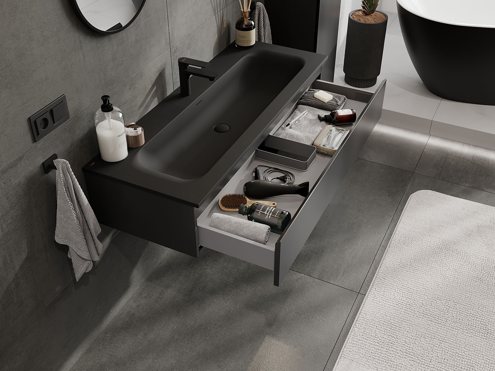Výřez v zásuvce je navržen tak, aby pojmul sifon, který je nezbytný v instalacích umyvadlových. Díky tomu může být nábytek plně funkčně namontován, aniž by bylo nutné vzdát se prostoru v zásuvce ve prospěch instalace.