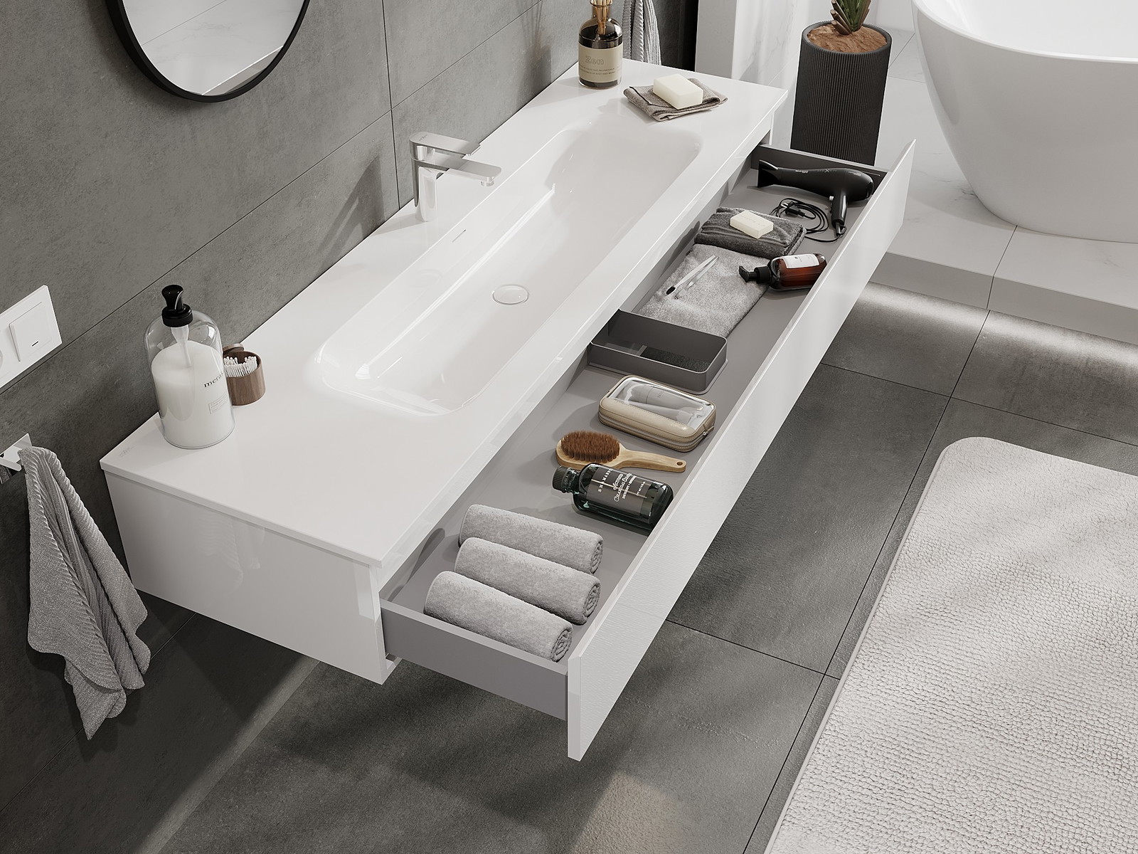 Výřez v zásuvce je navržen tak, aby pojmul sifon, který je nezbytný v instalacích umyvadlových. Díky tomu může být nábytek plně funkčně namontován, aniž by bylo nutné vzdát se prostoru v zásuvce ve prospěch instalace.
