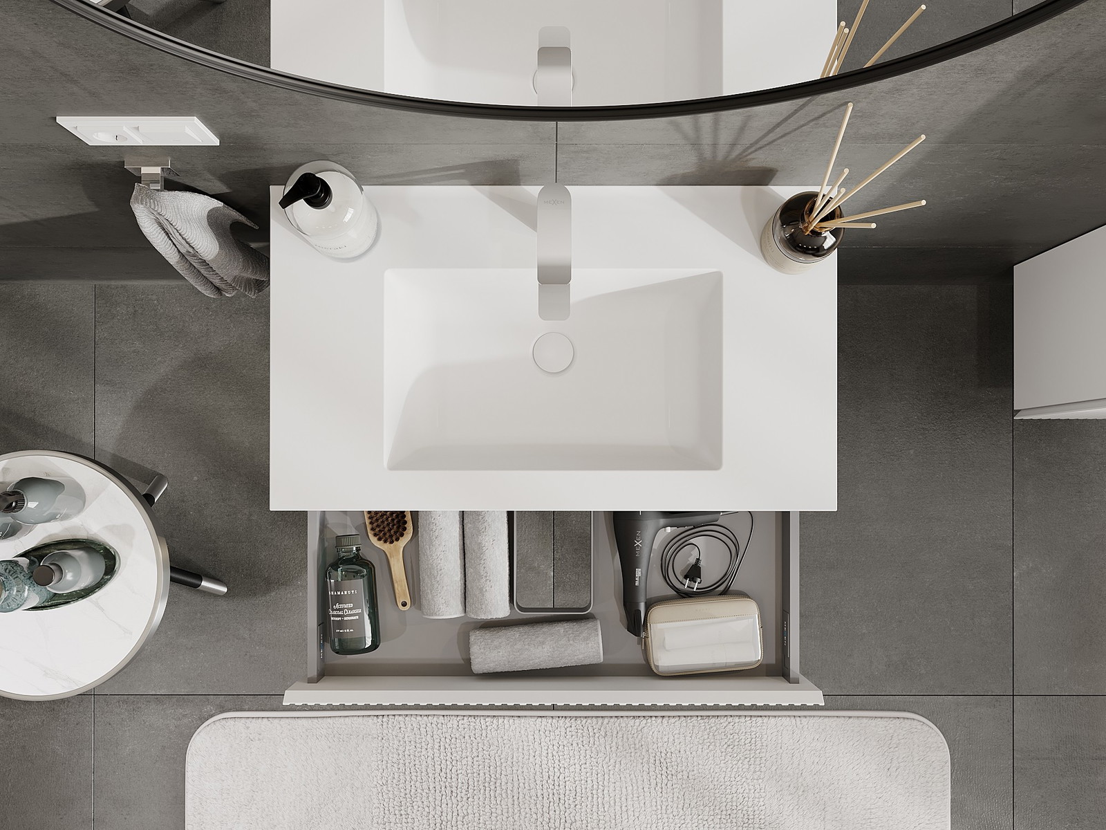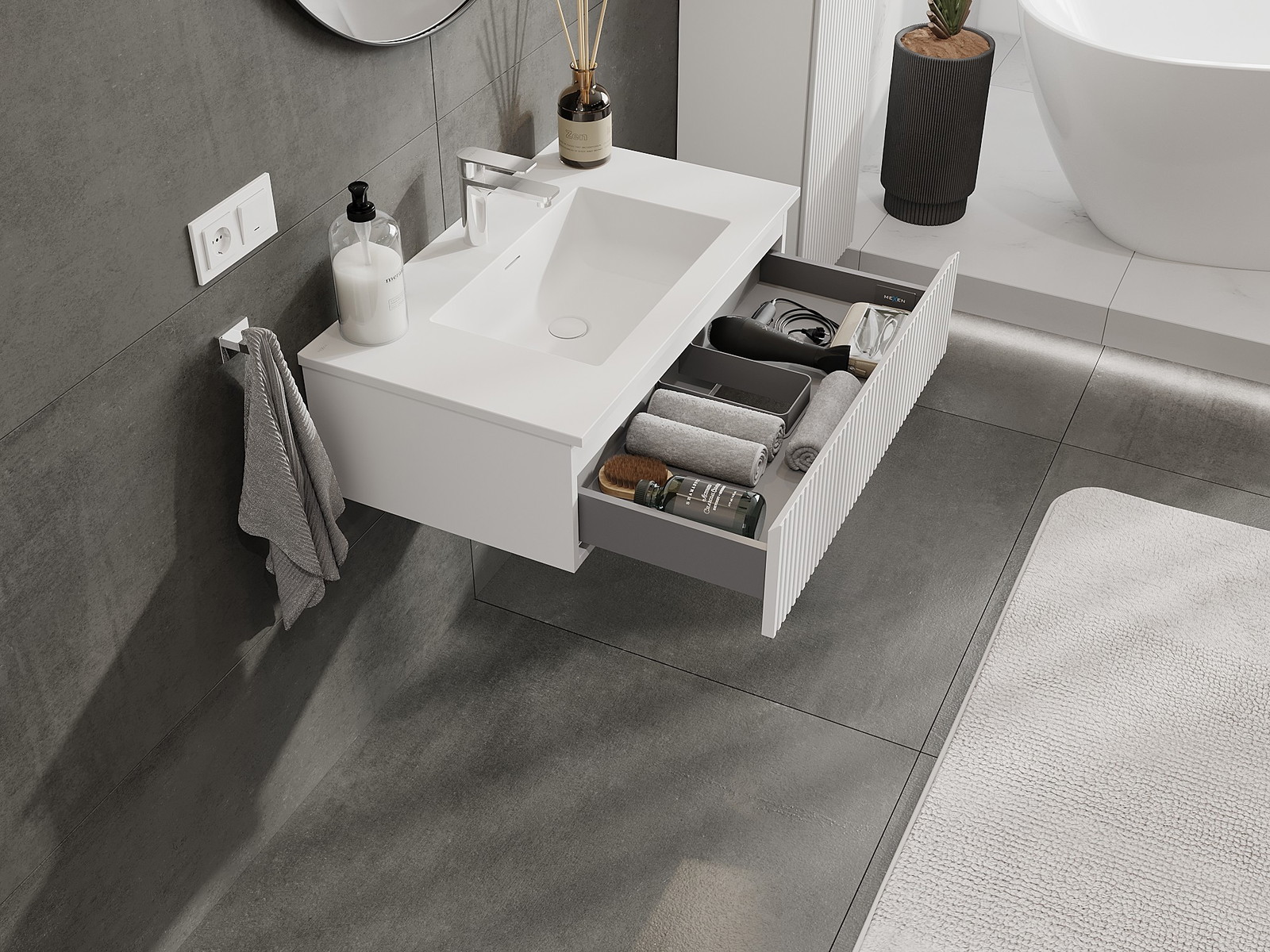 Výřez v zásuvce je navržen tak, aby pojmul sifon, který je nezbytný v instalacích umyvadlových. Díky tomu může být nábytek plně funkčně namontován, aniž by bylo nutné vzdát se prostoru v zásuvce ve prospěch instalace.