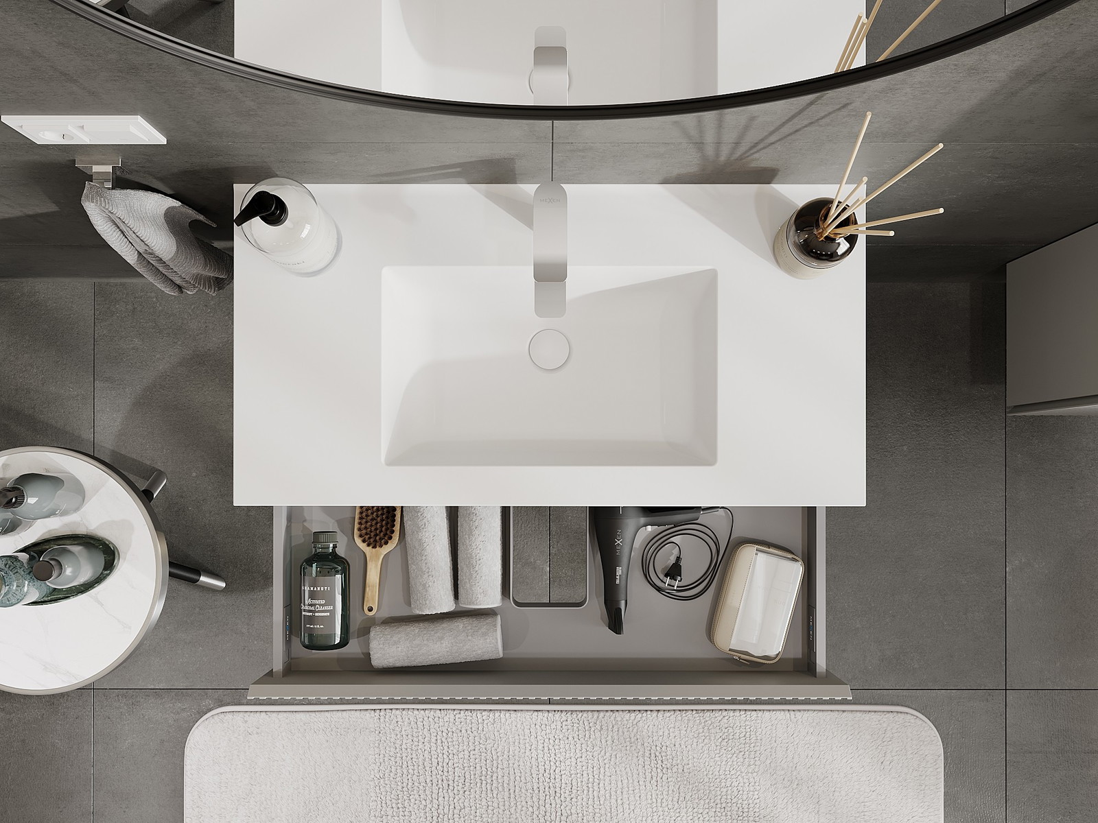 Výřez v zásuvce je navržen tak, aby pojmul sifon, který je nezbytný v instalacích umyvadlových. Díky tomu může být nábytek plně funkčně namontován, aniž by bylo nutné vzdát se prostoru v zásuvce ve prospěch instalace.