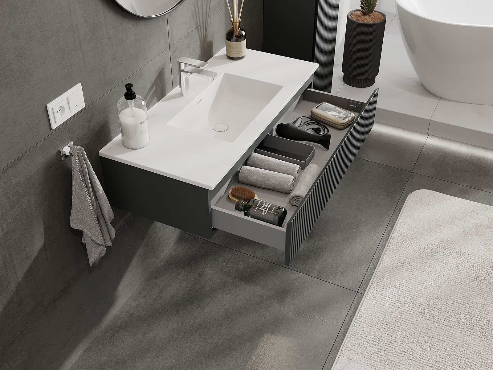Mexen Rivel koupelnová skříňka 100 cm s umyvadlem Otis, 1 zásuvka, drážkovaná, grafit mat/bílá mat - 91A20-10023-1-BF66-W18M01