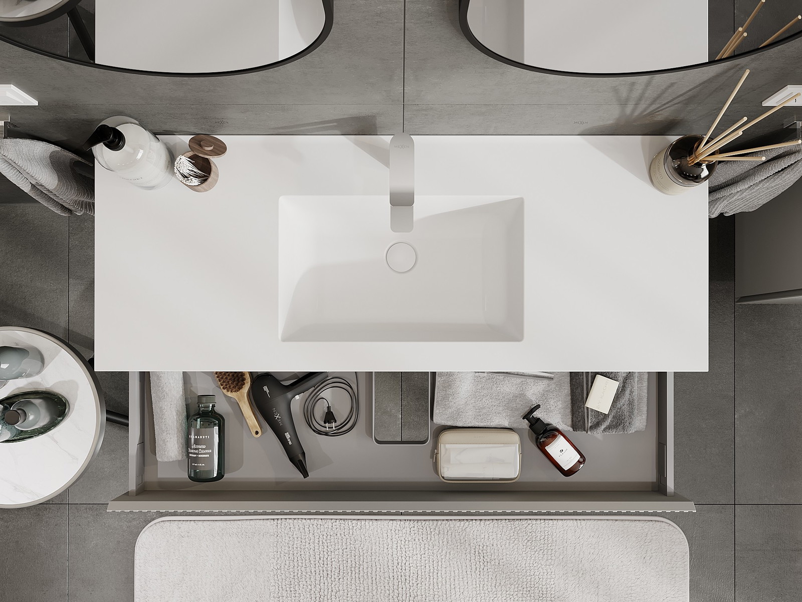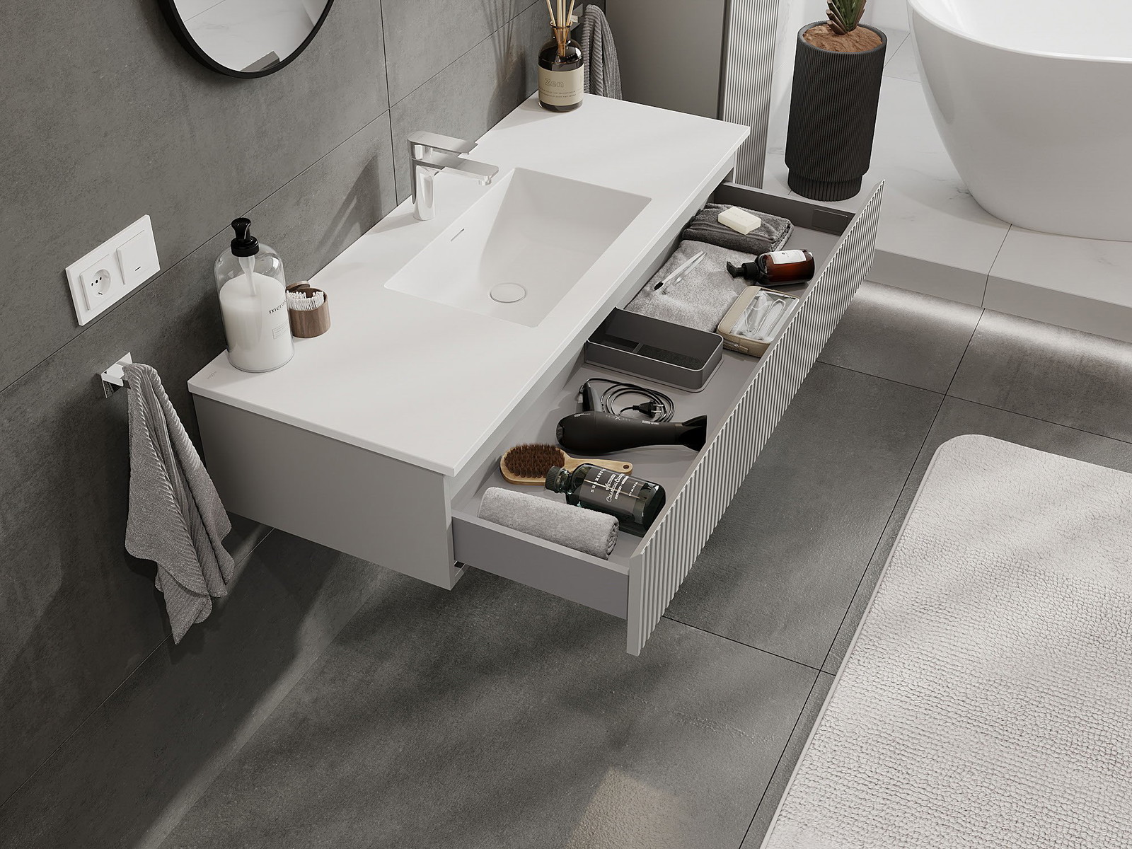 Výřez v zásuvce je navržen tak, aby pojmul sifon, který je nezbytný v instalacích umyvadlových. Díky tomu může být nábytek plně funkčně namontován, aniž by bylo nutné vzdát se prostoru v zásuvce ve prospěch instalace.