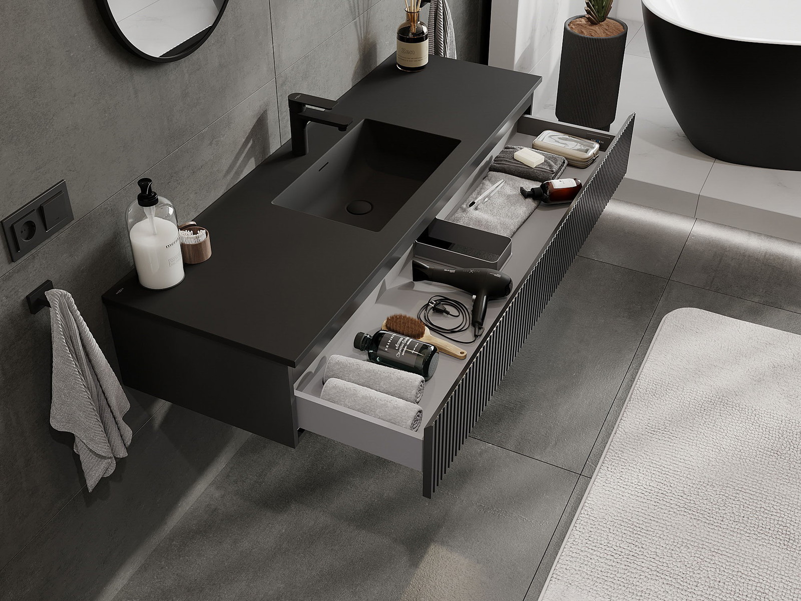 Mexen Rivel koupelnová skříňka 140 cm s umyvadlem Otis, 1 zásuvka, drážkovaná, černá mat - 91A20-14023-1-BF71-W18M71