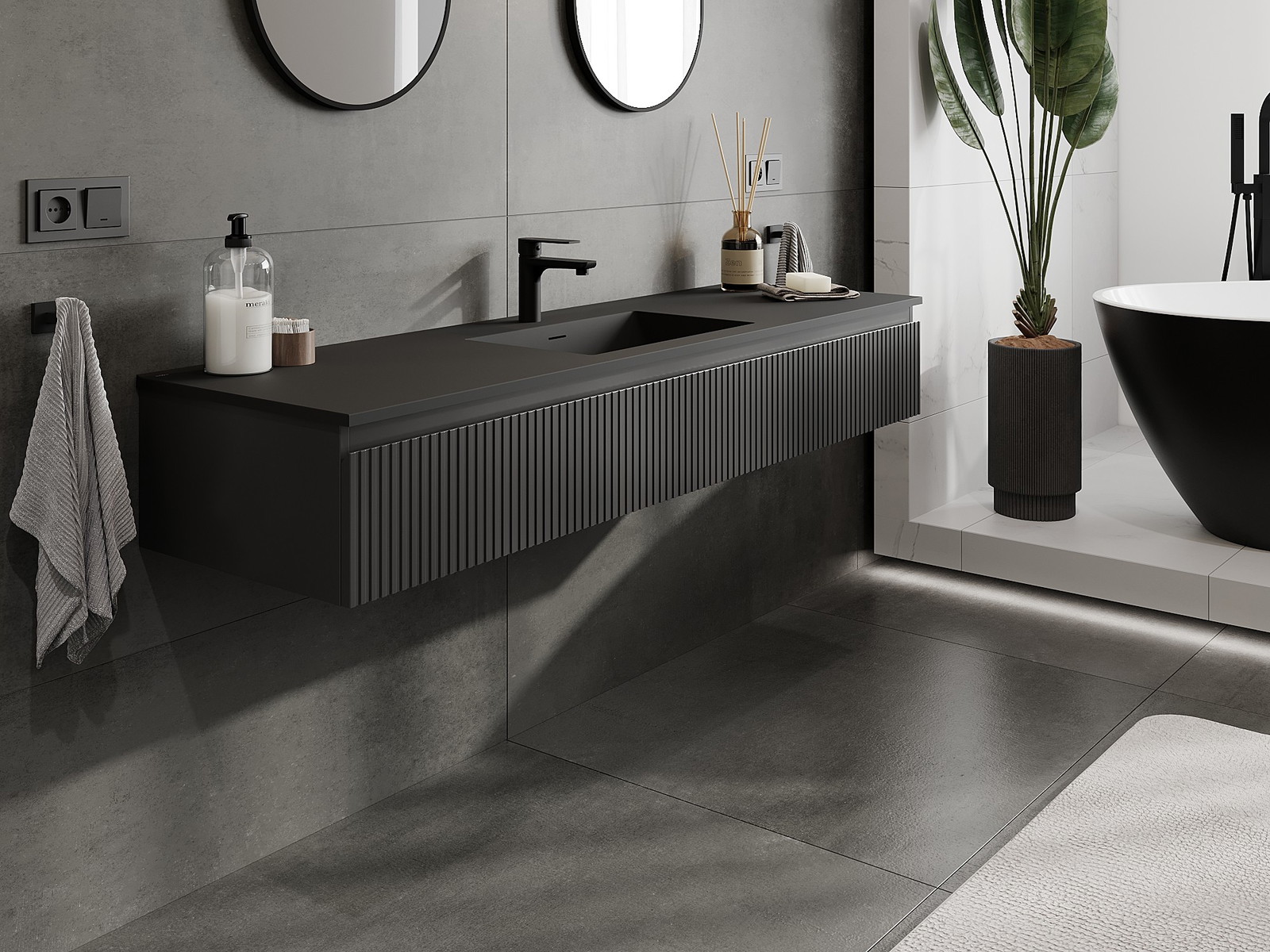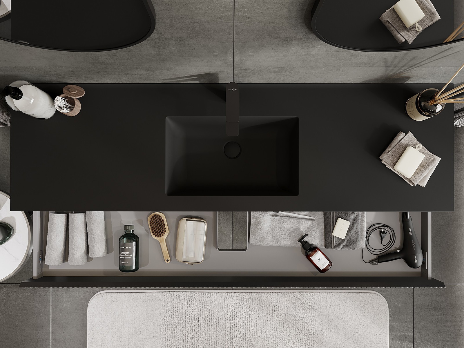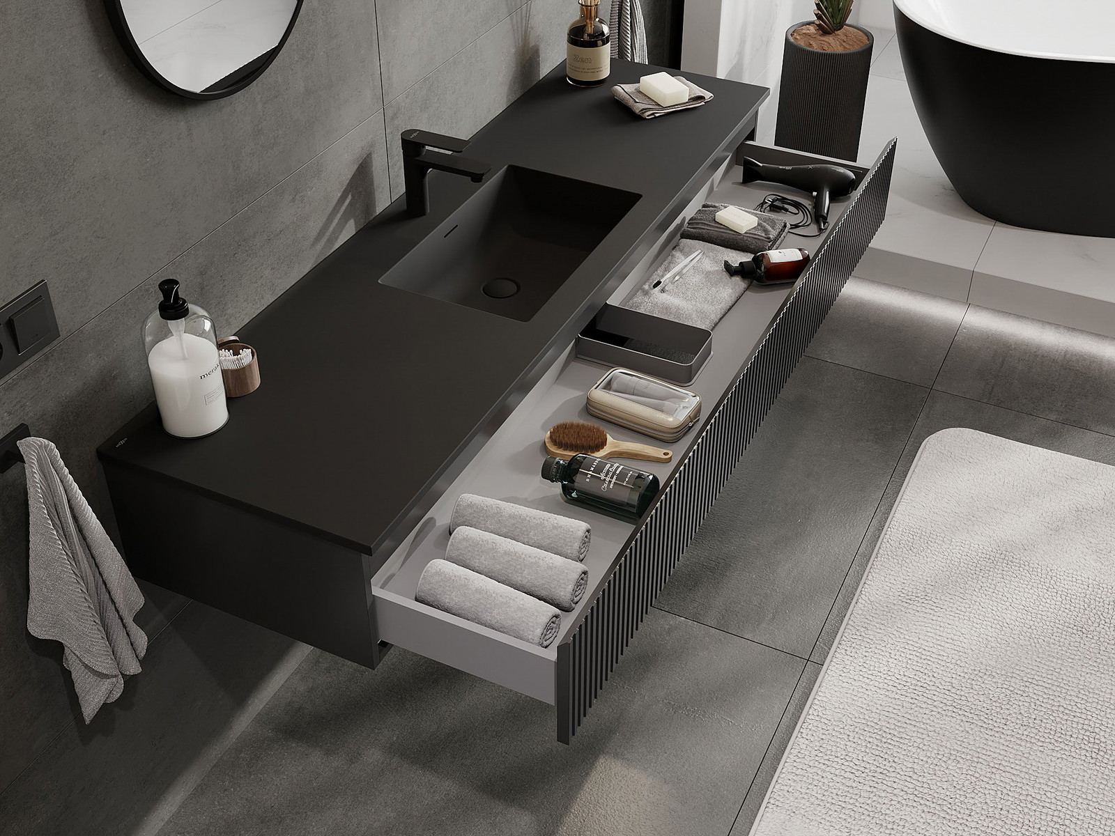 Mexen Rivel koupelnová skříňka 160 cm s umyvadlem Otis, 1 zásuvka, drážkovaná, černá mat - 91A20-16023-1-BF71-W18M71