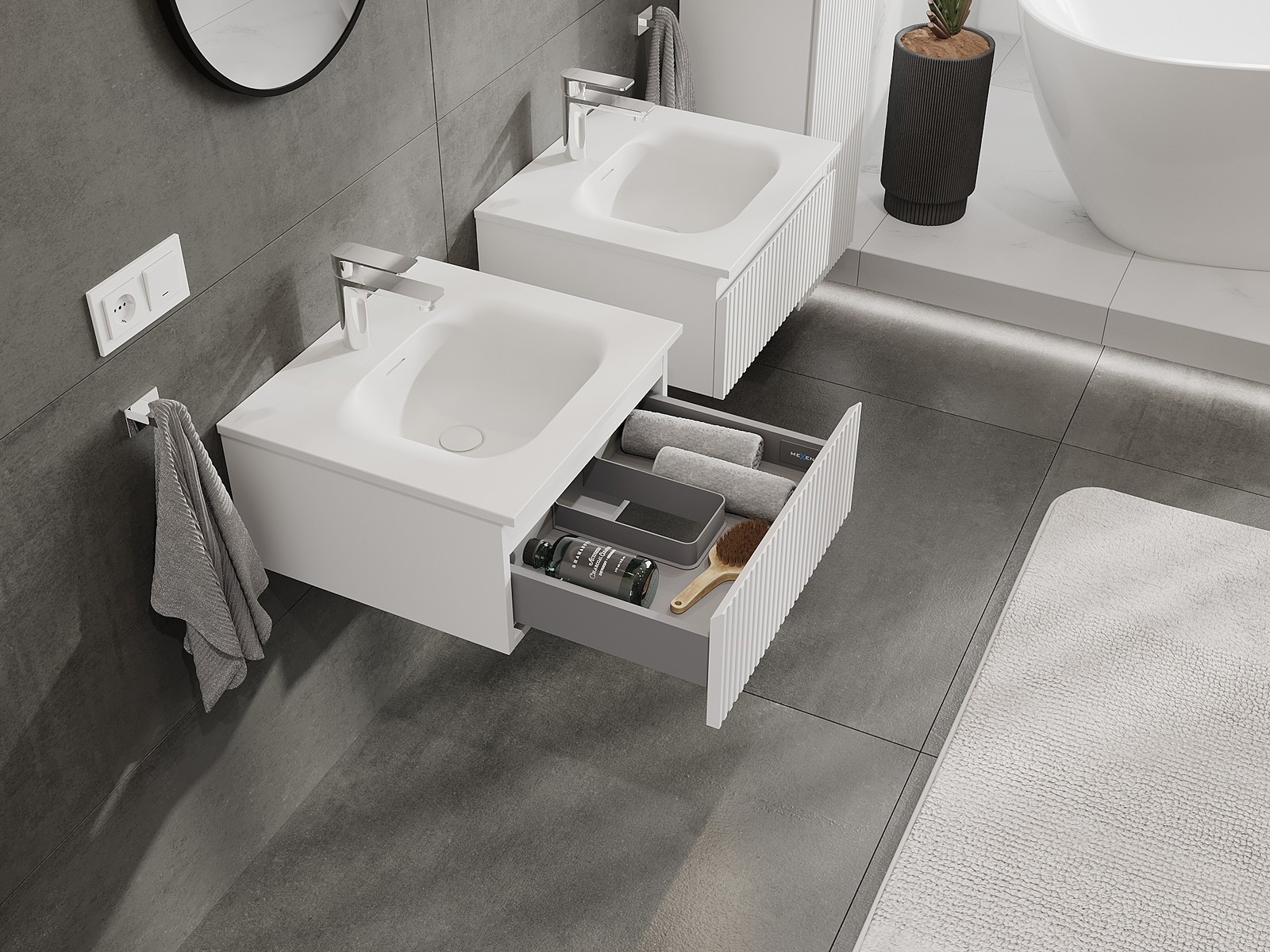 Korpus skříňky je dodáván zcela smontovaný, což znamená maximální pohodlí a úsporu času. Nemusíte ztrácet hodiny skládáním nábytku – stačí jej namontovat na vybrané místo v koupelně. Je to ideální řešení pro osoby, které si cení rychlé montáže a okamžitého efektu.