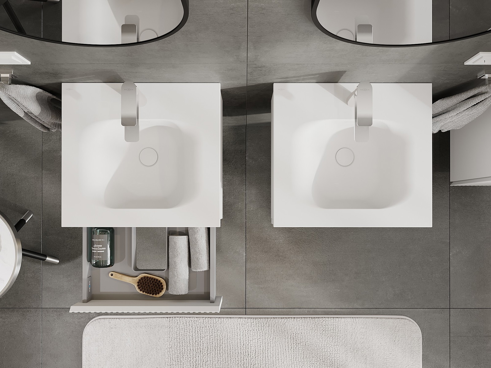 Výřez v zásuvce je navržen tak, aby pojmul sifon, který je nezbytný v instalacích umyvadlových. Díky tomu může být nábytek plně funkčně namontován, aniž by bylo nutné vzdát se prostoru v zásuvce ve prospěch instalace.
