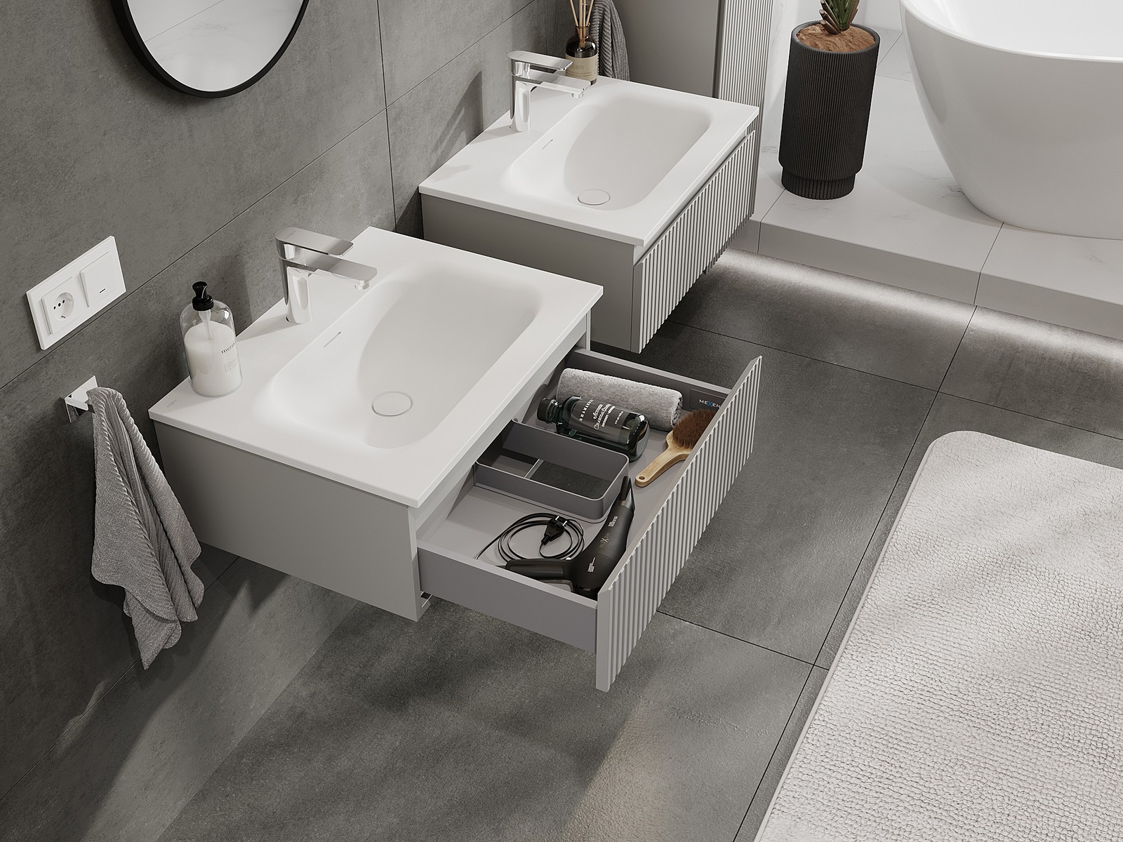 Výřez v zásuvce je navržen tak, aby pojmul sifon, který je nezbytný v instalacích umyvadlových. Díky tomu může být nábytek plně funkčně namontován, aniž by bylo nutné vzdát se prostoru v zásuvce ve prospěch instalace.
