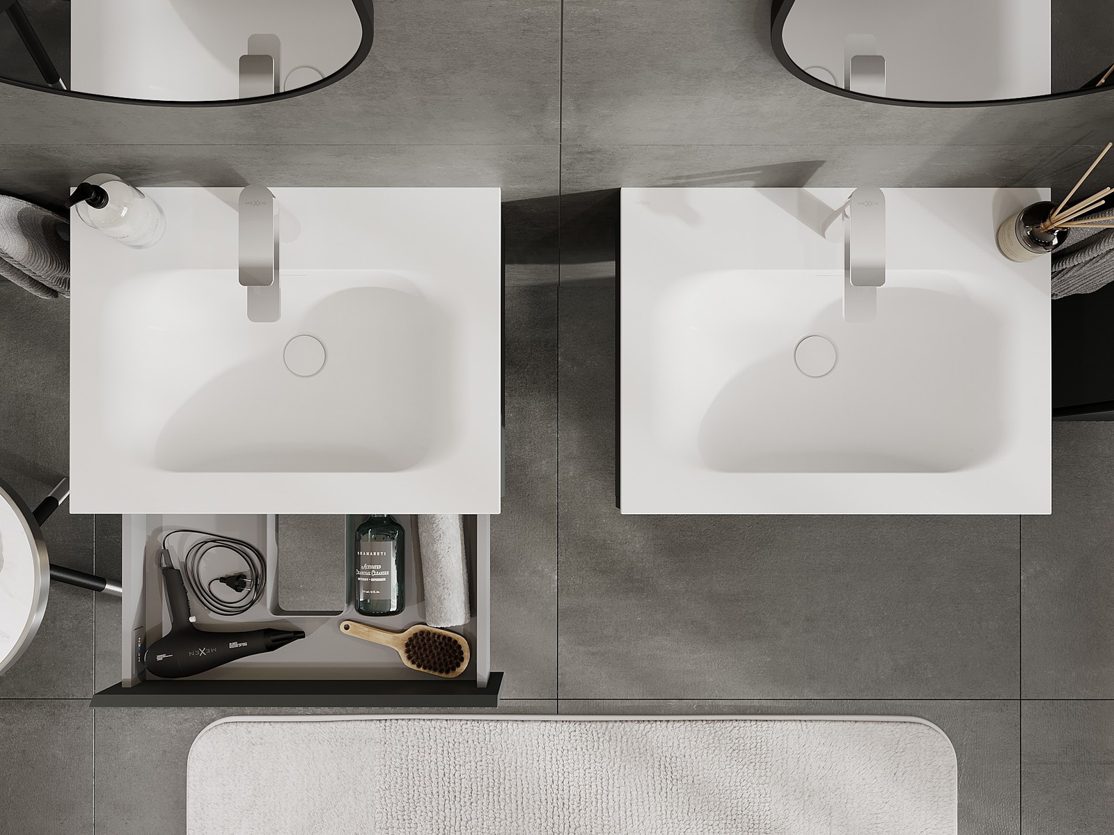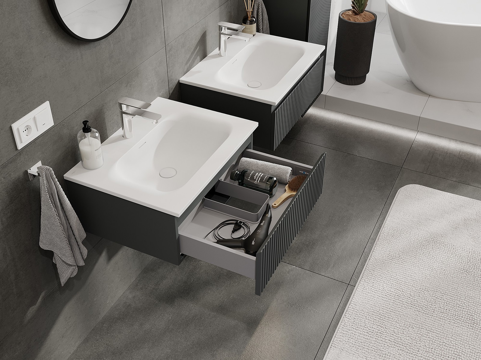 Výřez v zásuvce je navržen tak, aby pojmul sifon, který je nezbytný v instalacích umyvadlových. Díky tomu může být nábytek plně funkčně namontován, aniž by bylo nutné vzdát se prostoru v zásuvce ve prospěch instalace.