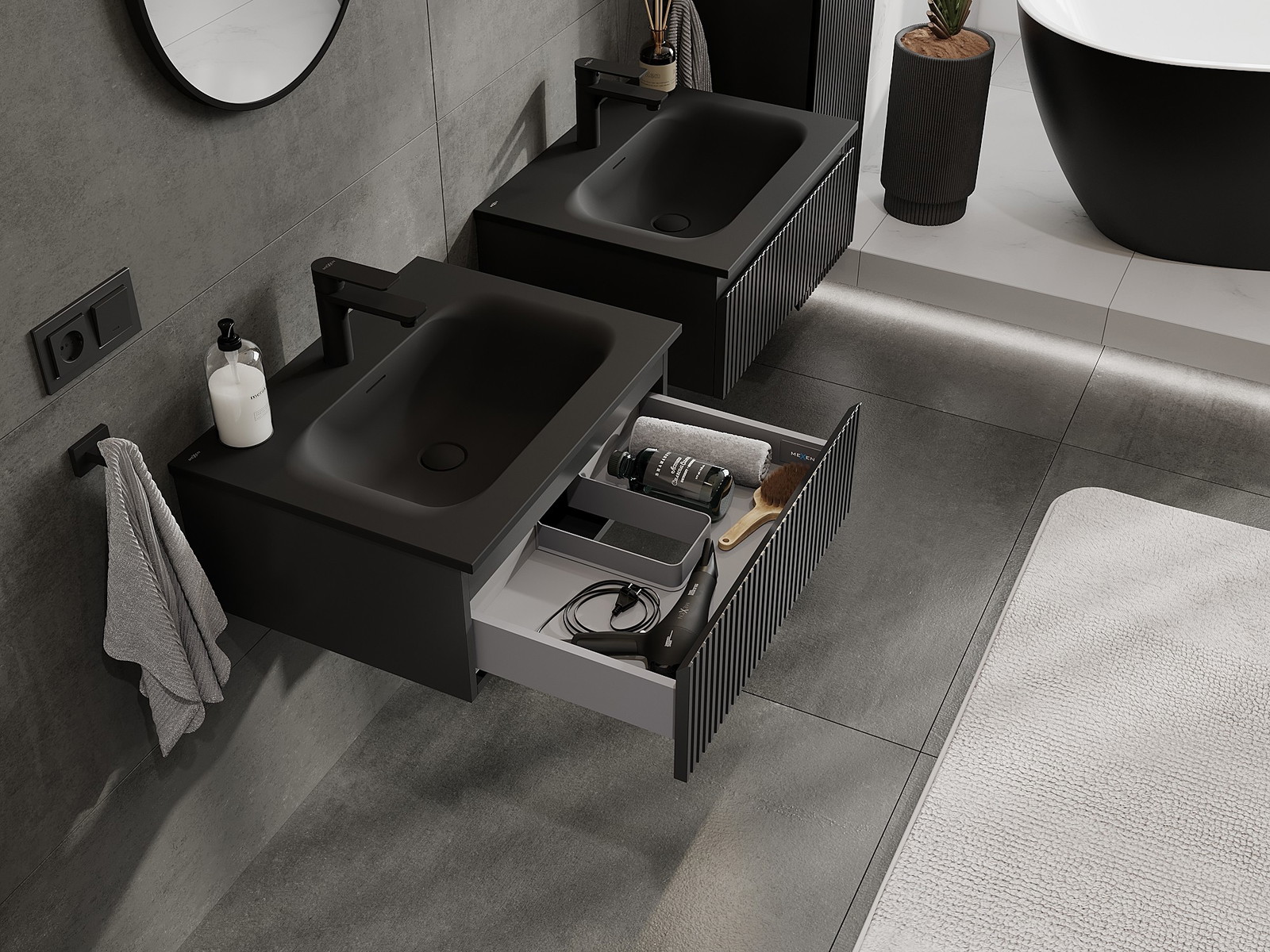 Výřez v zásuvce je navržen tak, aby pojmul sifon, který je nezbytný v instalacích umyvadlových. Díky tomu může být nábytek plně funkčně namontován, aniž by bylo nutné vzdát se prostoru v zásuvce ve prospěch instalace.