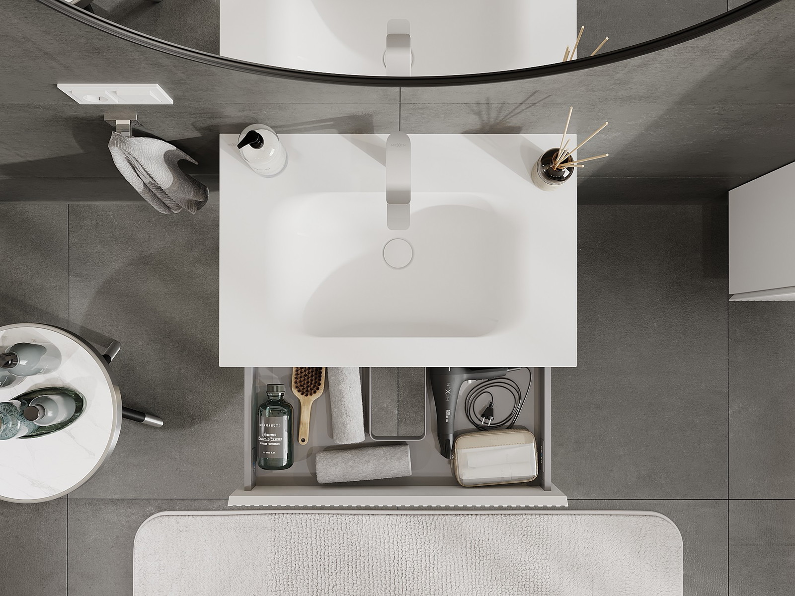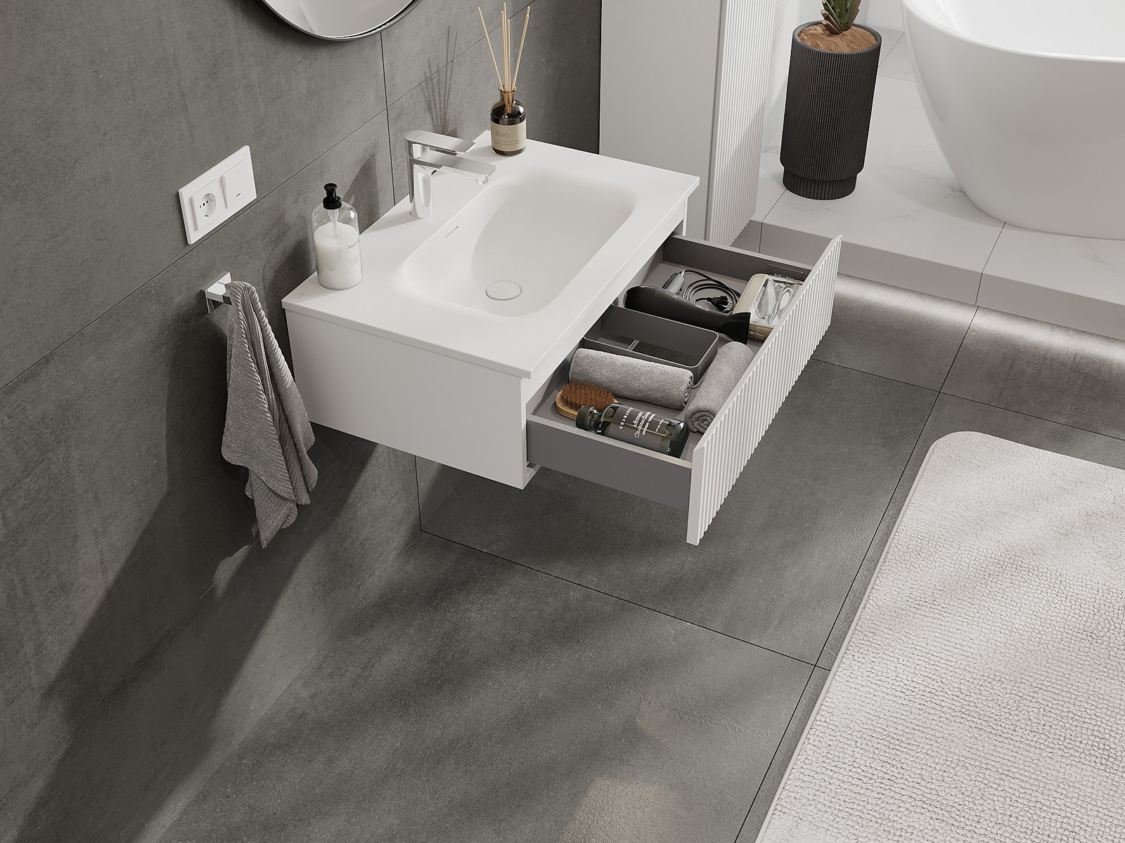 Výřez v zásuvce je navržen tak, aby pojmul sifon, který je nezbytný v instalacích umyvadlových. Díky tomu může být nábytek plně funkčně namontován, aniž by bylo nutné vzdát se prostoru v zásuvce ve prospěch instalace.