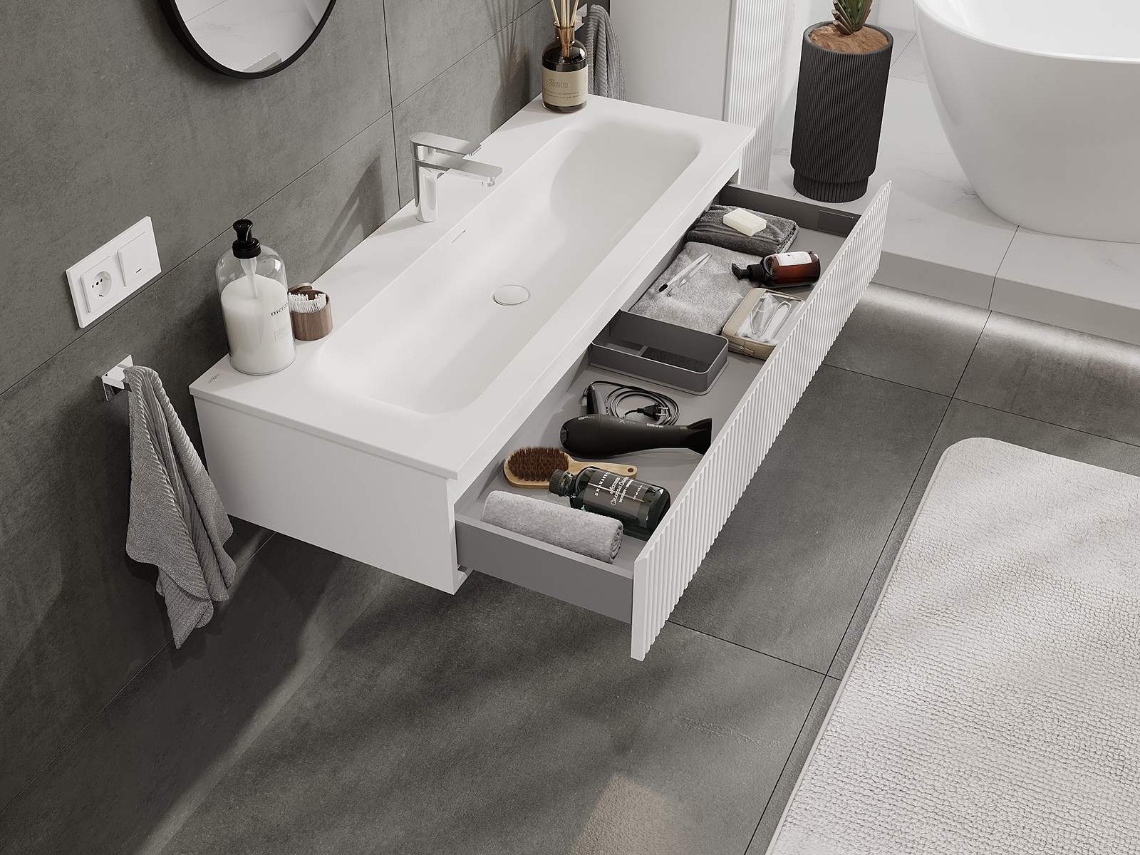 Výřez v zásuvce je navržen tak, aby pojmul sifon, který je nezbytný v instalacích umyvadlových. Díky tomu může být nábytek plně funkčně namontován, aniž by bylo nutné vzdát se prostoru v zásuvce ve prospěch instalace.