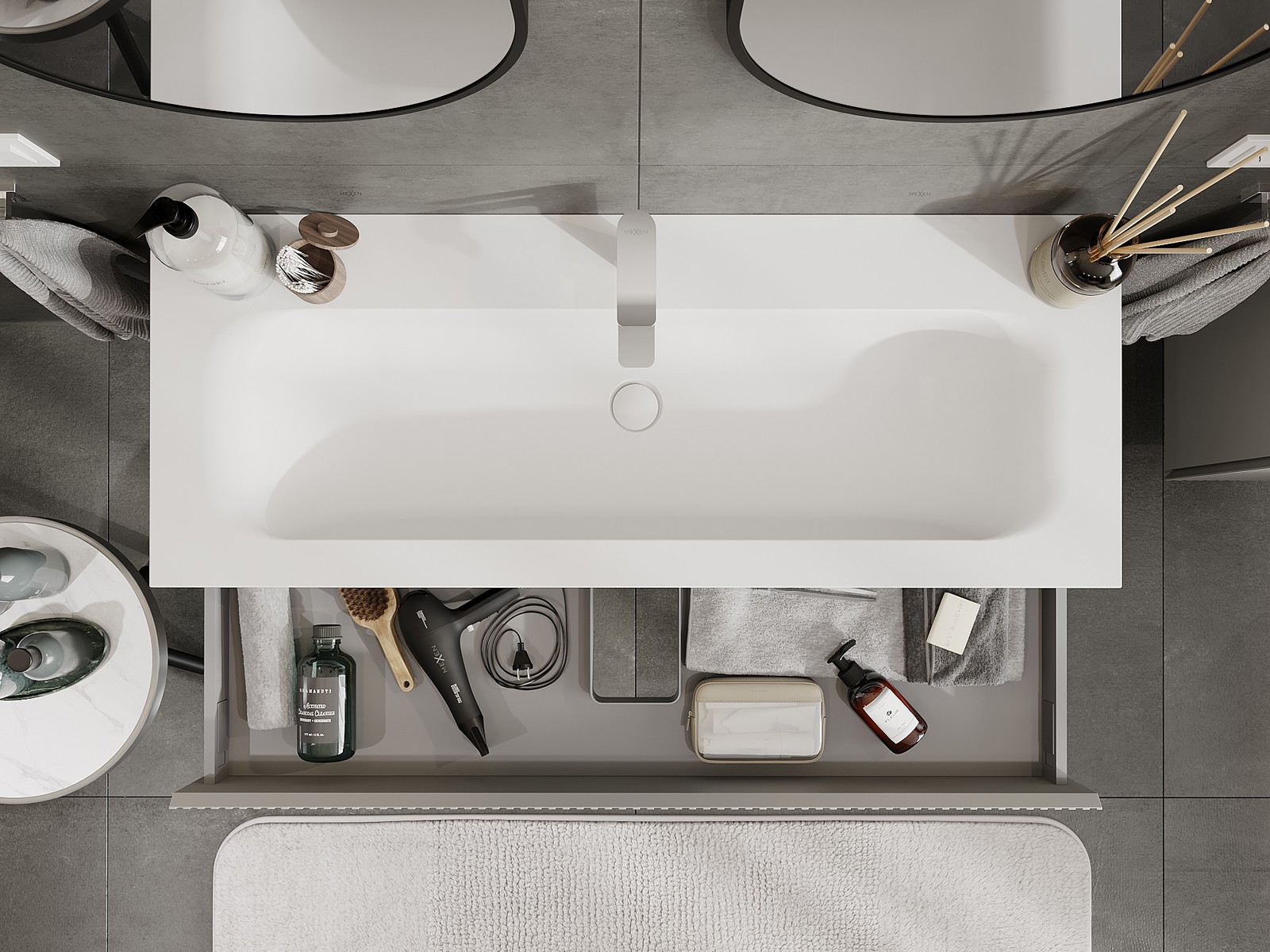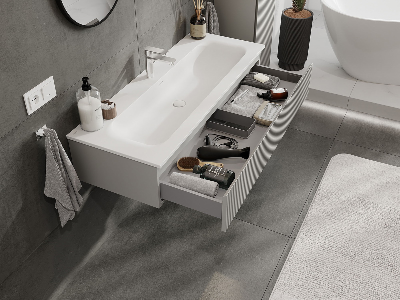 Výřez v zásuvce je navržen tak, aby pojmul sifon, který je nezbytný v instalacích umyvadlových. Díky tomu může být nábytek plně funkčně namontován, aniž by bylo nutné vzdát se prostoru v zásuvce ve prospěch instalace.