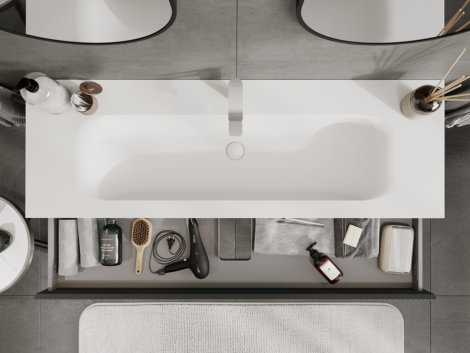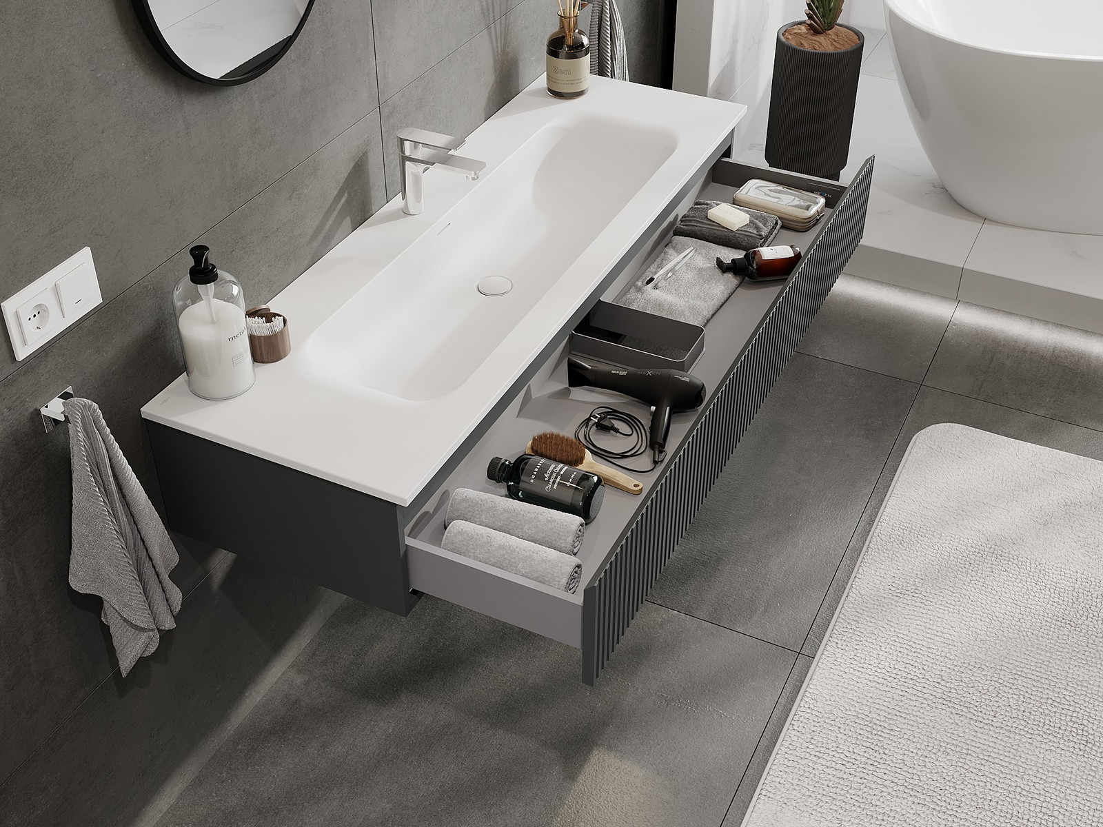 Výřez v zásuvce je navržen tak, aby pojmul sifon, který je nezbytný v instalacích umyvadlových. Díky tomu může být nábytek plně funkčně namontován, aniž by bylo nutné vzdát se prostoru v zásuvce ve prospěch instalace.