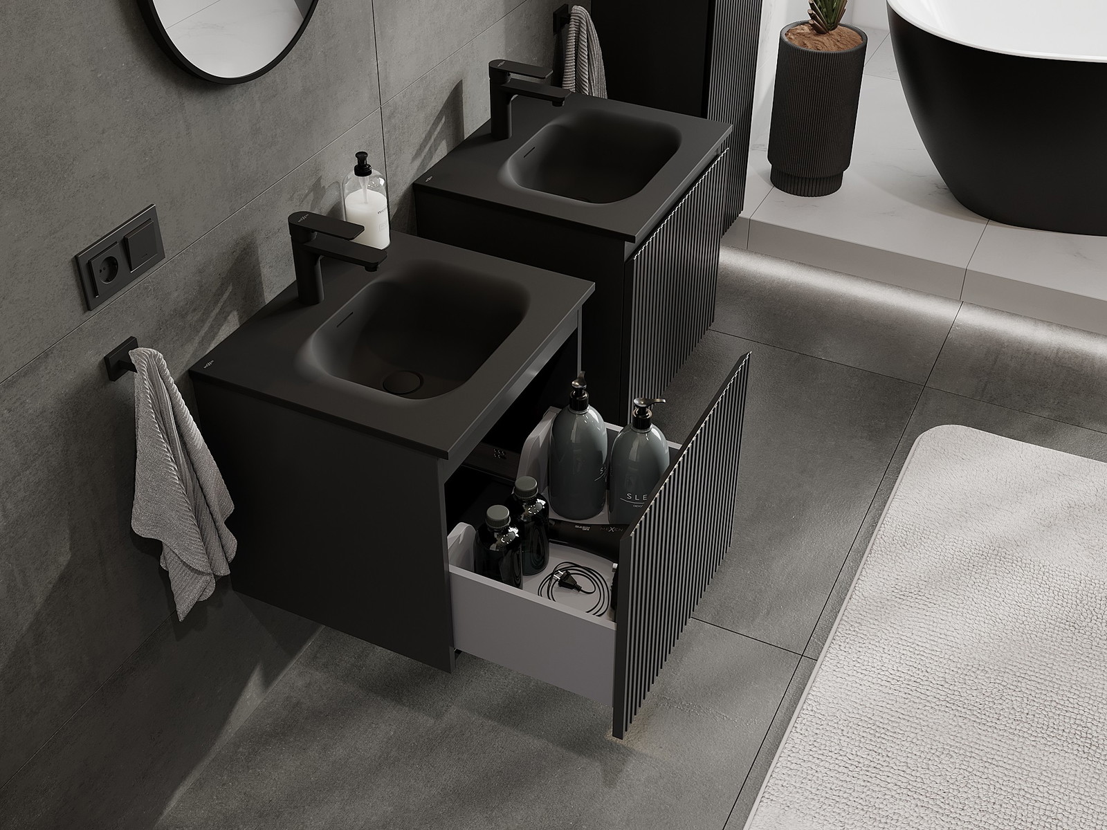 Výřez v zásuvce je navržen tak, aby pojmul sifon, který je nezbytný v instalacích umyvadlových. Díky tomu může být nábytek plně funkčně namontován, aniž by bylo nutné vzdát se prostoru v zásuvce ve prospěch instalace.