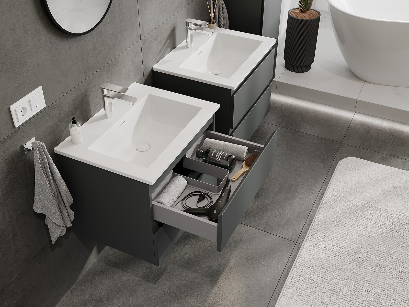 Naše modulární koupelnový nábytek lze kombinovat v různých barevných konfiguracích, což umožňuje plnou personalizaci. Můžete si vybrat jak vzhled, tak funkce jednotlivých prvků, což umožňuje přizpůsobit nábytek vašim stylovým a uživatelským preferencím.