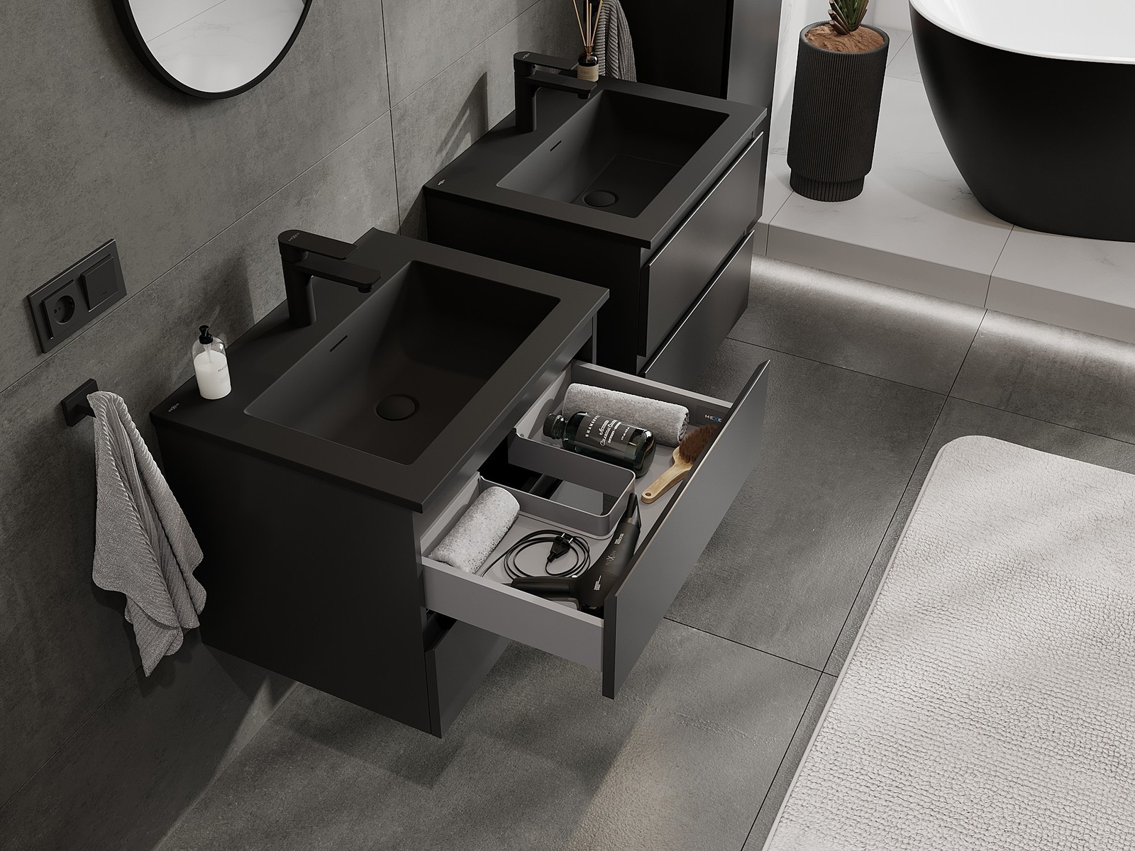 Výřez v zásuvce je navržen tak, aby pojmul sifon, který je nezbytný v instalacích umyvadlových. Díky tomu může být nábytek plně funkčně namontován, aniž by bylo nutné vzdát se prostoru v zásuvce ve prospěch instalace.