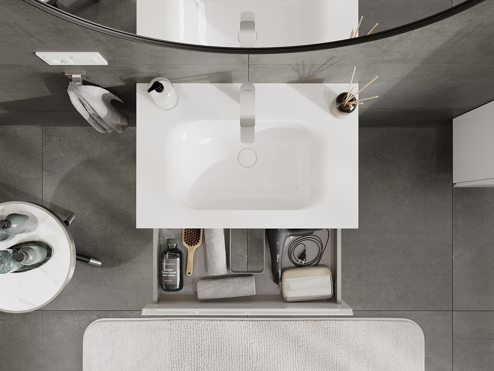 Výřez v zásuvce je navržen tak, aby pojmul sifon, který je nezbytný v instalacích umyvadlových. Díky tomu může být nábytek plně funkčně namontován, aniž by bylo nutné vzdát se prostoru v zásuvce ve prospěch instalace.