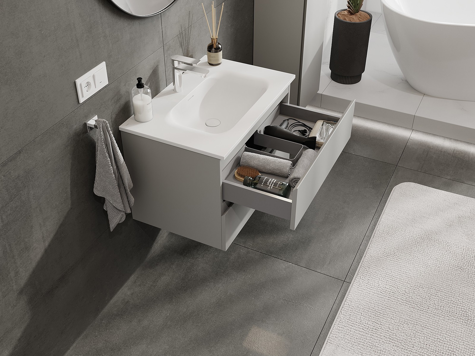 Výřez v zásuvce je navržen tak, aby pojmul sifon, který je nezbytný v instalacích umyvadlových. Díky tomu může být nábytek plně funkčně namontován, aniž by bylo nutné vzdát se prostoru v zásuvce ve prospěch instalace.