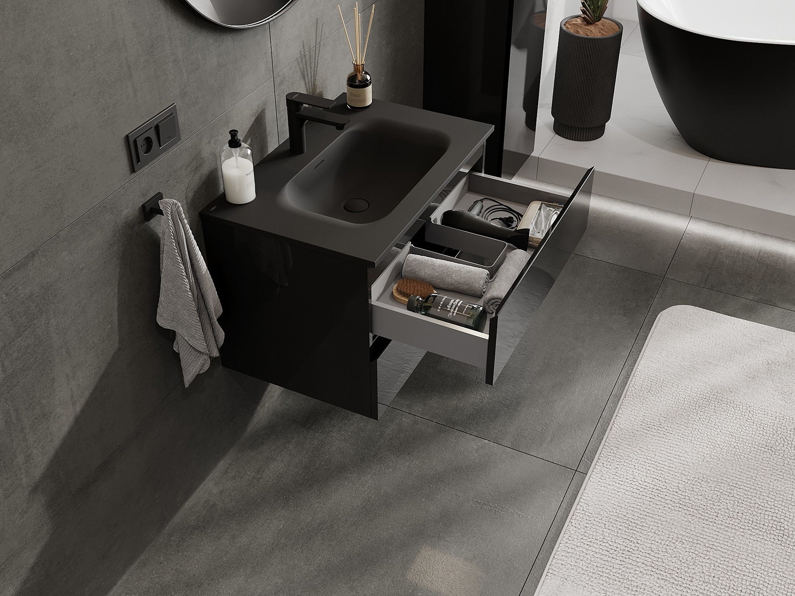 Výřez v zásuvce je navržen tak, aby pojmul sifon, který je nezbytný v instalacích umyvadlových. Díky tomu může být nábytek plně funkčně namontován, aniž by bylo nutné vzdát se prostoru v zásuvce ve prospěch instalace.