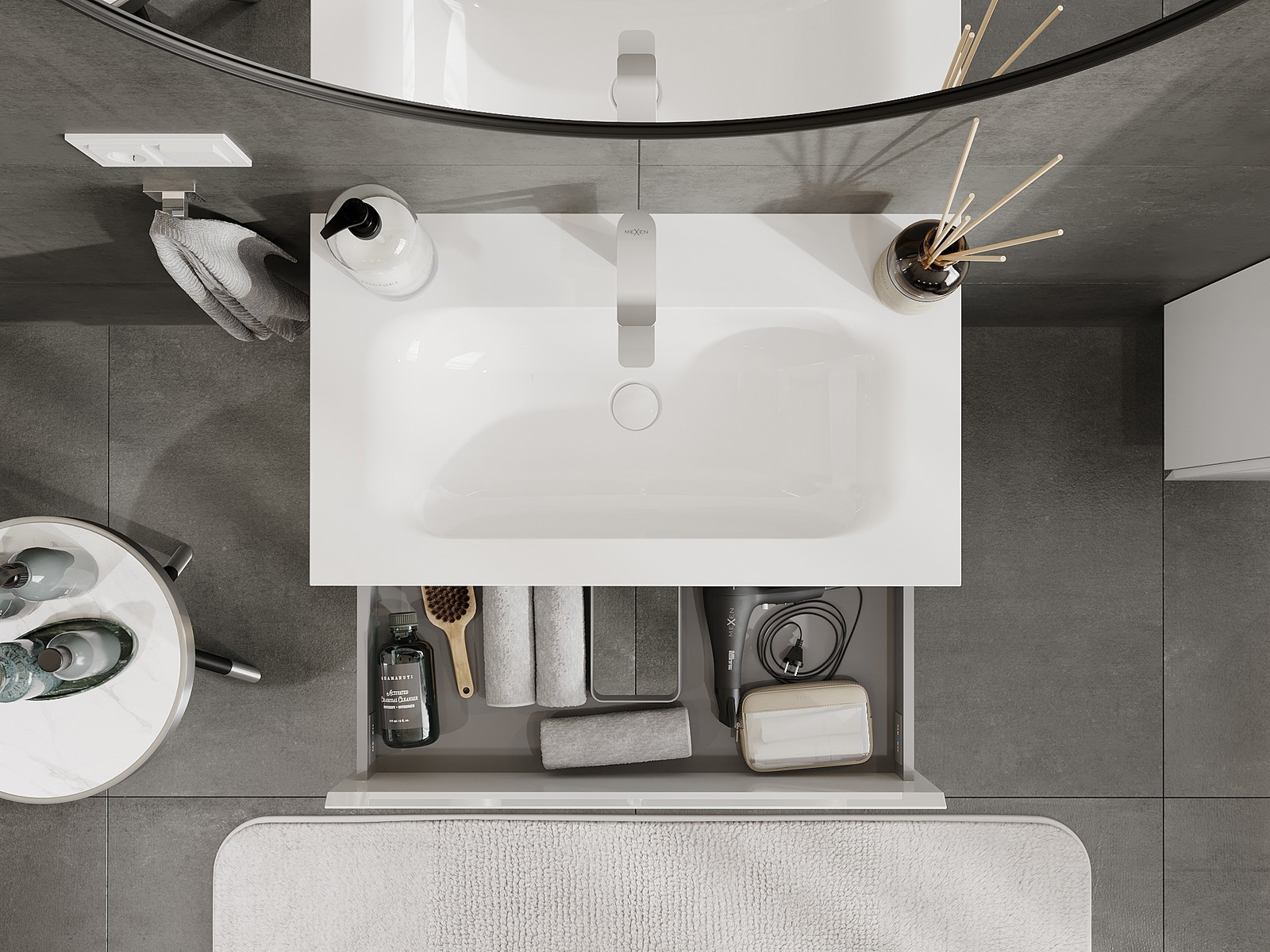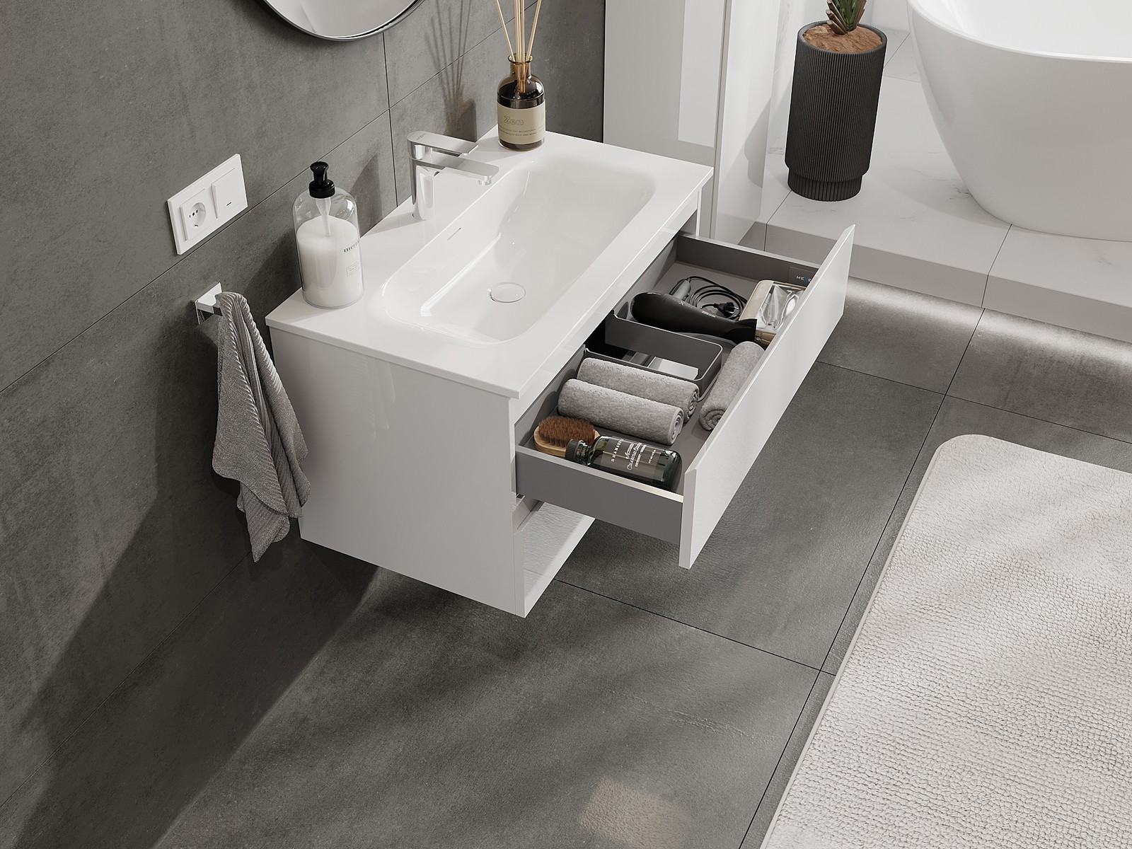 Výřez v zásuvce je navržen tak, aby pojmul sifon, který je nezbytný v instalacích umyvadlových. Díky tomu může být nábytek plně funkčně namontován, aniž by bylo nutné vzdát se prostoru v zásuvce ve prospěch instalace.
