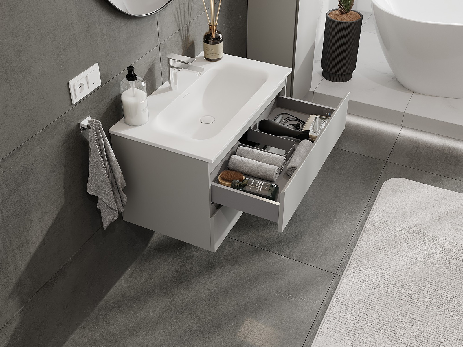 Výřez v zásuvce je navržen tak, aby pojmul sifon, který je nezbytný v instalacích umyvadlových. Díky tomu může být nábytek plně funkčně namontován, aniž by bylo nutné vzdát se prostoru v zásuvce ve prospěch instalace.