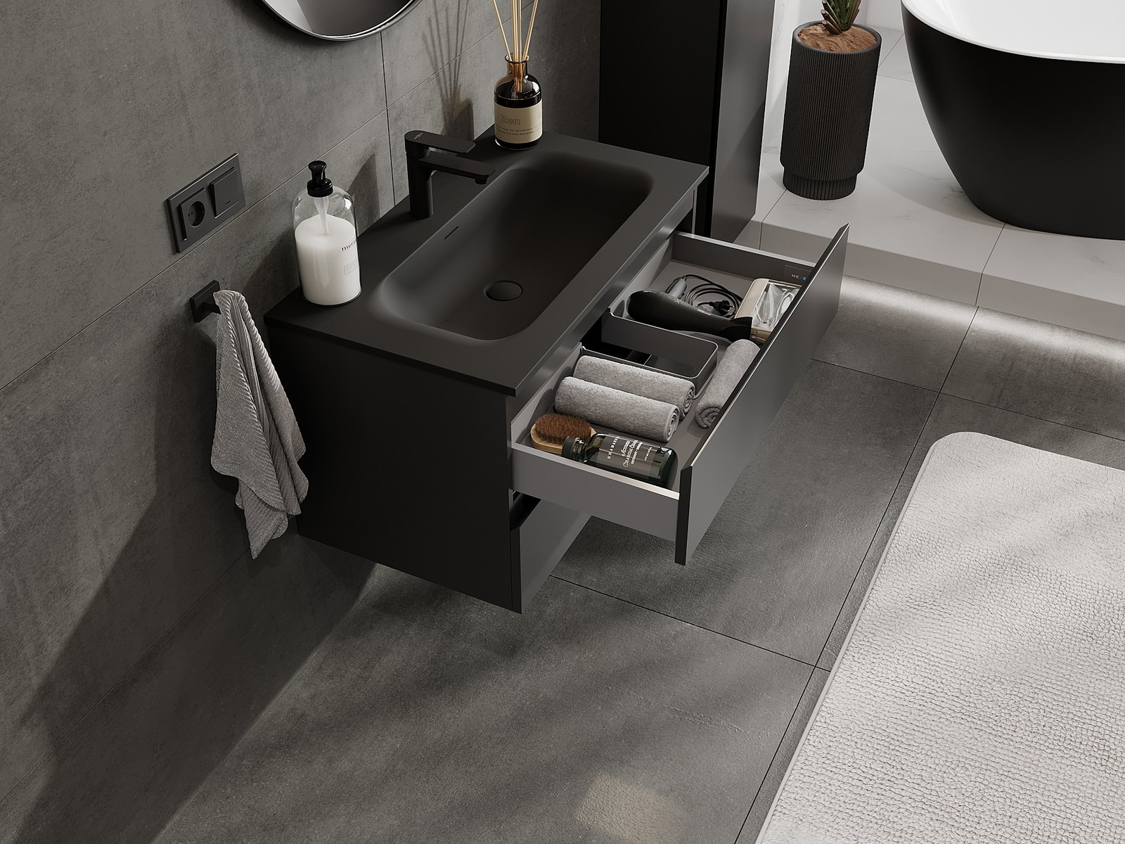 Výřez v zásuvce je navržen tak, aby pojmul sifon, který je nezbytný v instalacích umyvadlových. Díky tomu může být nábytek plně funkčně namontován, aniž by bylo nutné vzdát se prostoru v zásuvce ve prospěch instalace.