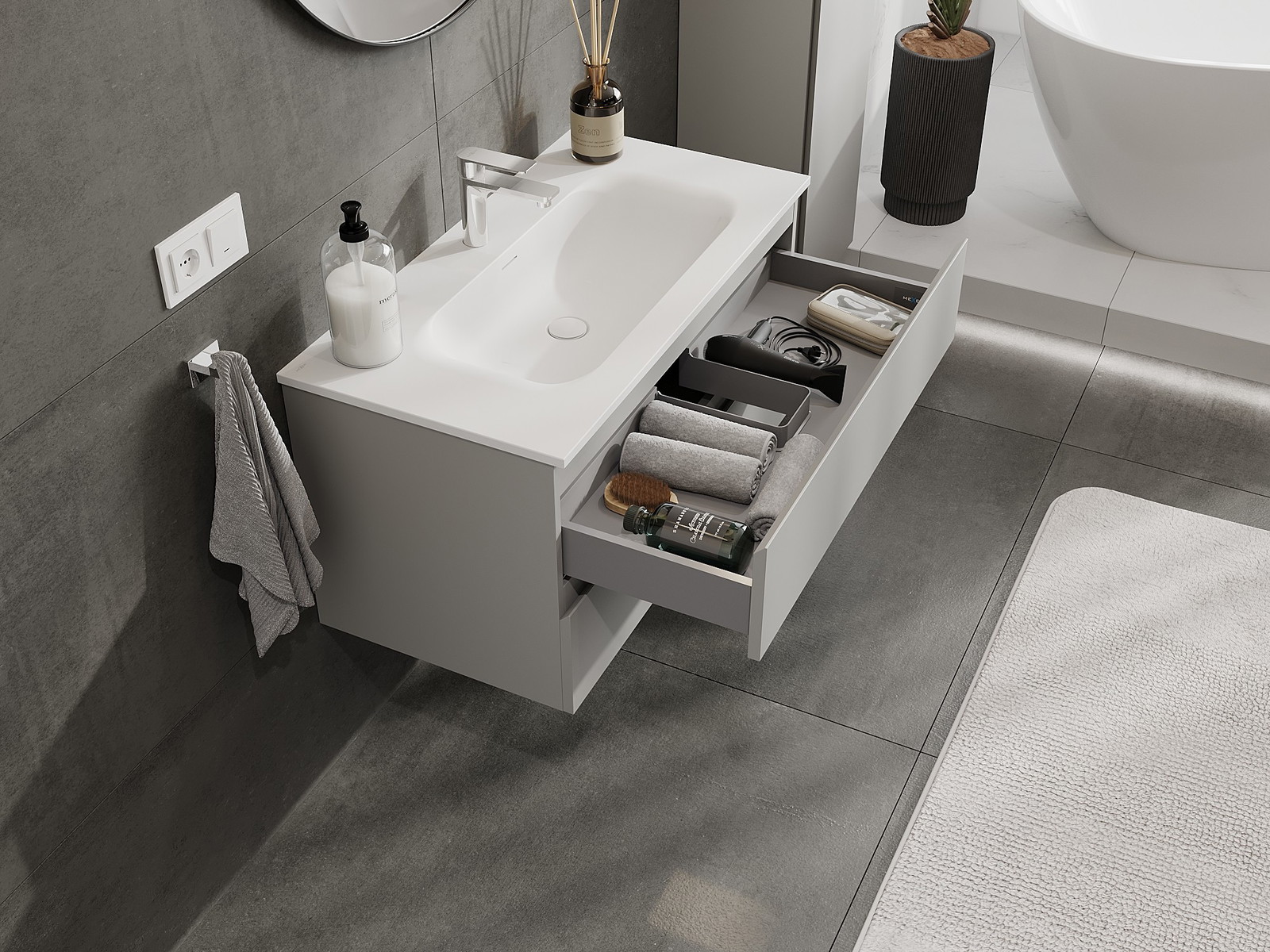 Výřez v zásuvce je navržen tak, aby pojmul sifon, který je nezbytný v instalacích umyvadlových. Díky tomu může být nábytek plně funkčně namontován, aniž by bylo nutné vzdát se prostoru v zásuvce ve prospěch instalace.