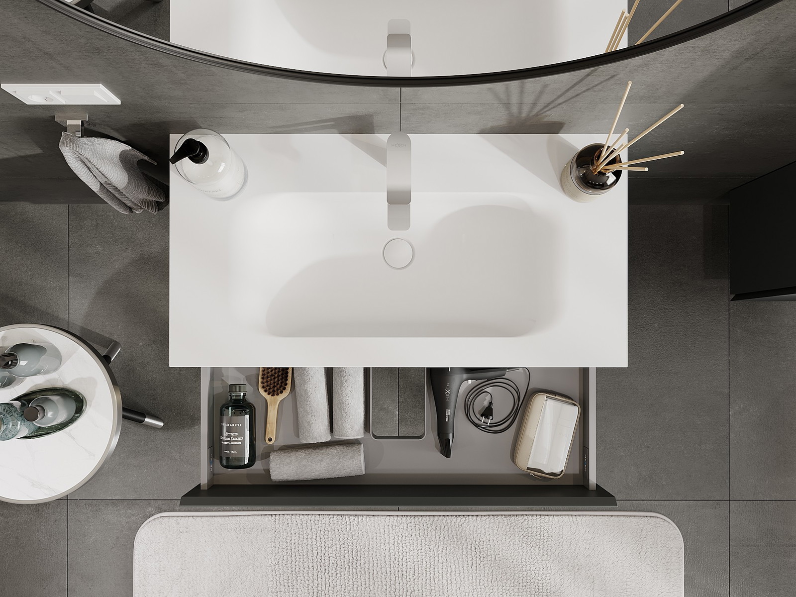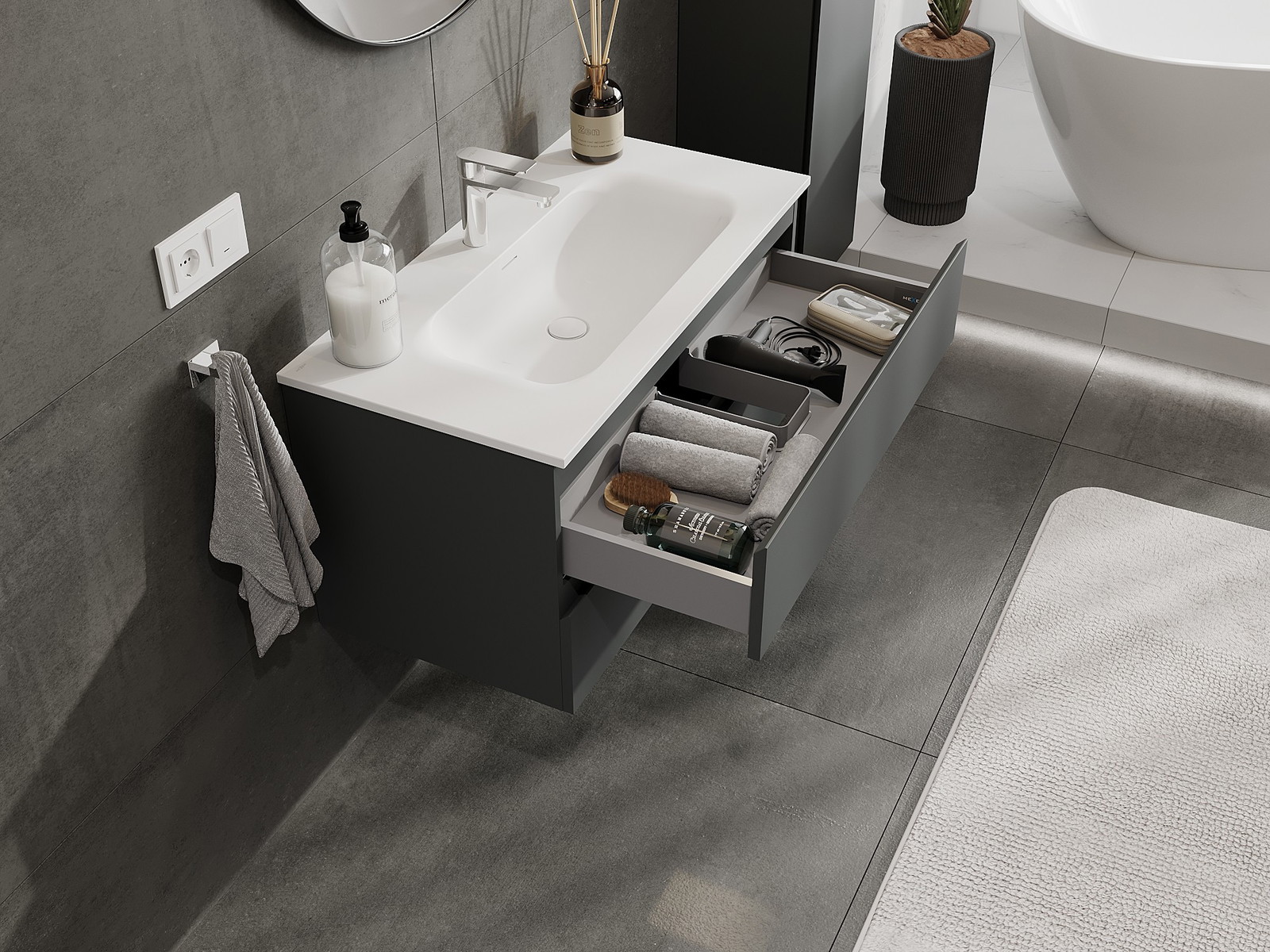 Výřez v zásuvce je navržen tak, aby pojmul sifon, který je nezbytný v instalacích umyvadlových. Díky tomu může být nábytek plně funkčně namontován, aniž by bylo nutné vzdát se prostoru v zásuvce ve prospěch instalace.