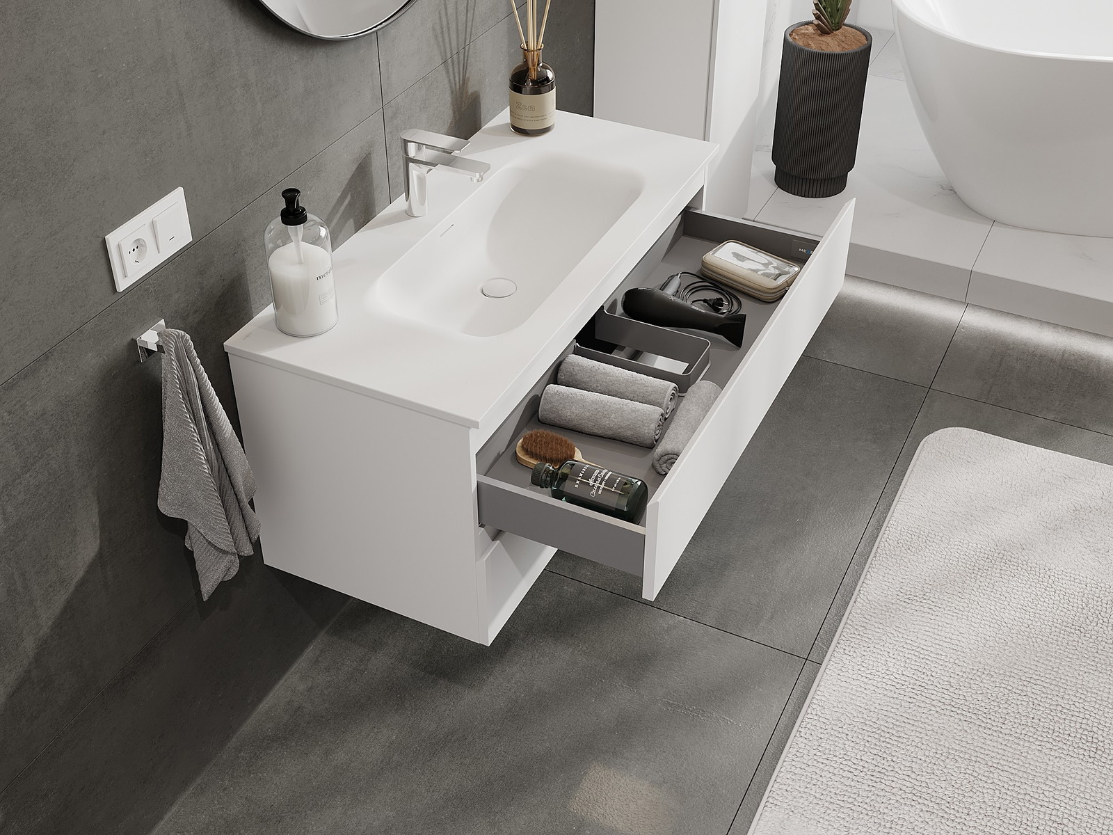 Výřez v zásuvce je navržen tak, aby pojmul sifon, který je nezbytný v instalacích umyvadlových. Díky tomu může být nábytek plně funkčně namontován, aniž by bylo nutné vzdát se prostoru v zásuvce ve prospěch instalace.