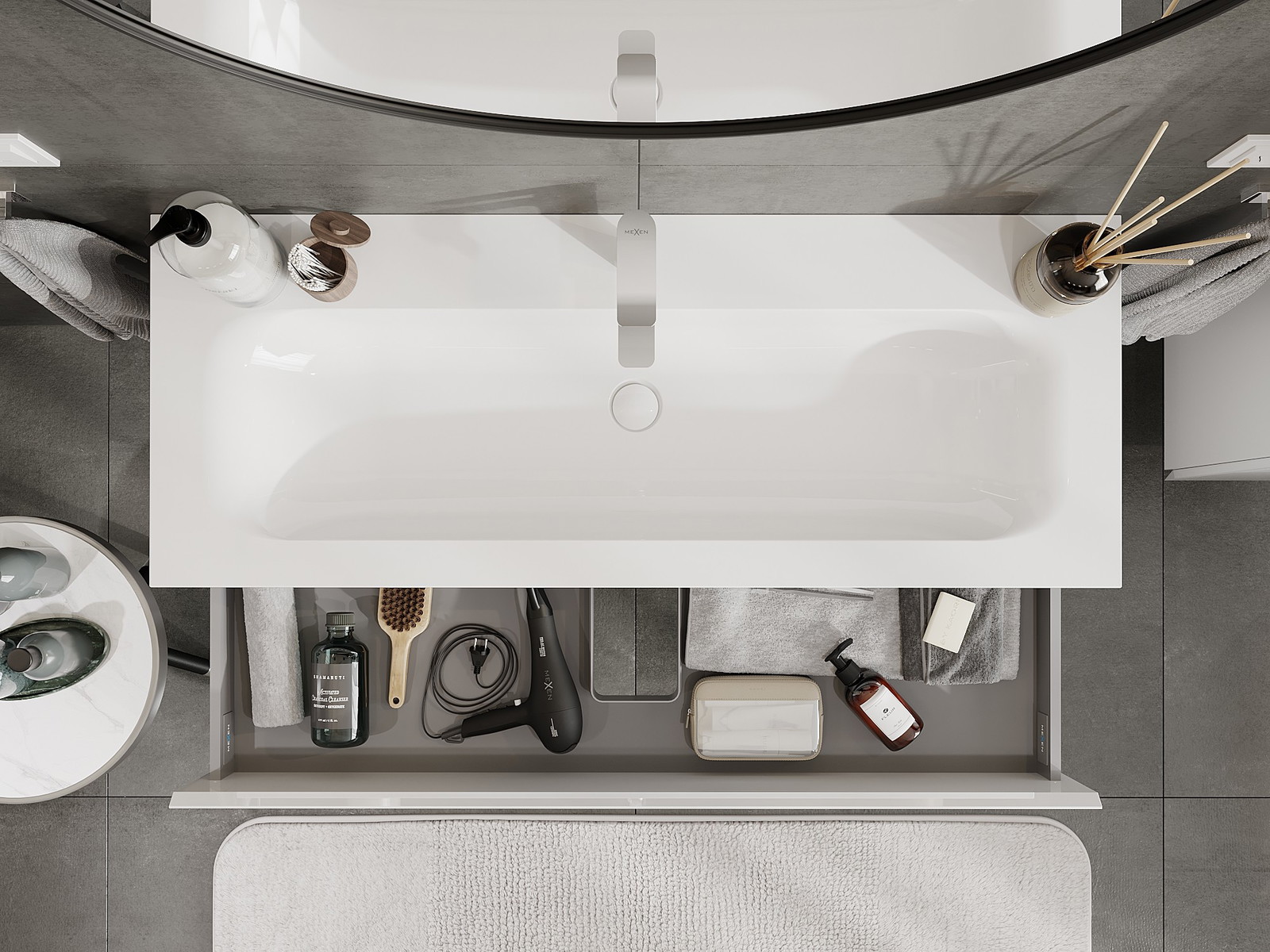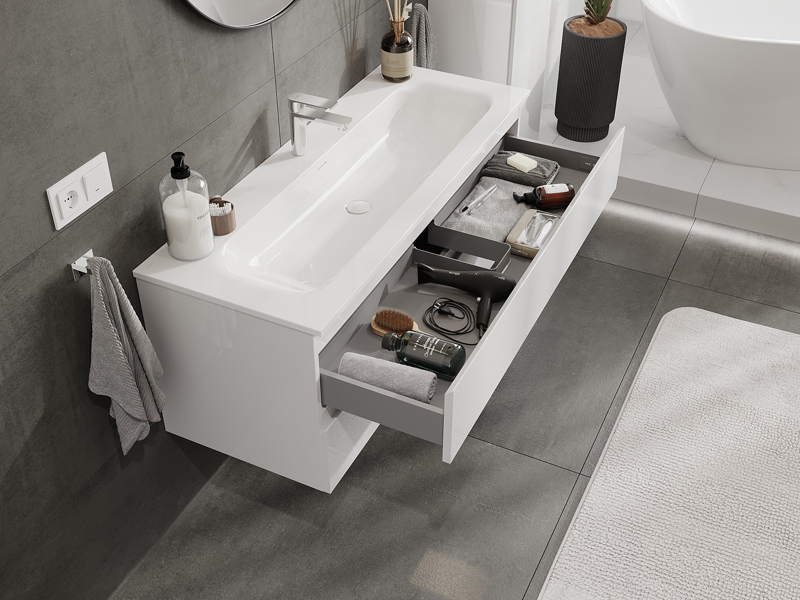 Výřez v zásuvce je navržen tak, aby pojmul sifon, který je nezbytný v instalacích umyvadlových. Díky tomu může být nábytek plně funkčně namontován, aniž by bylo nutné vzdát se prostoru v zásuvce ve prospěch instalace.