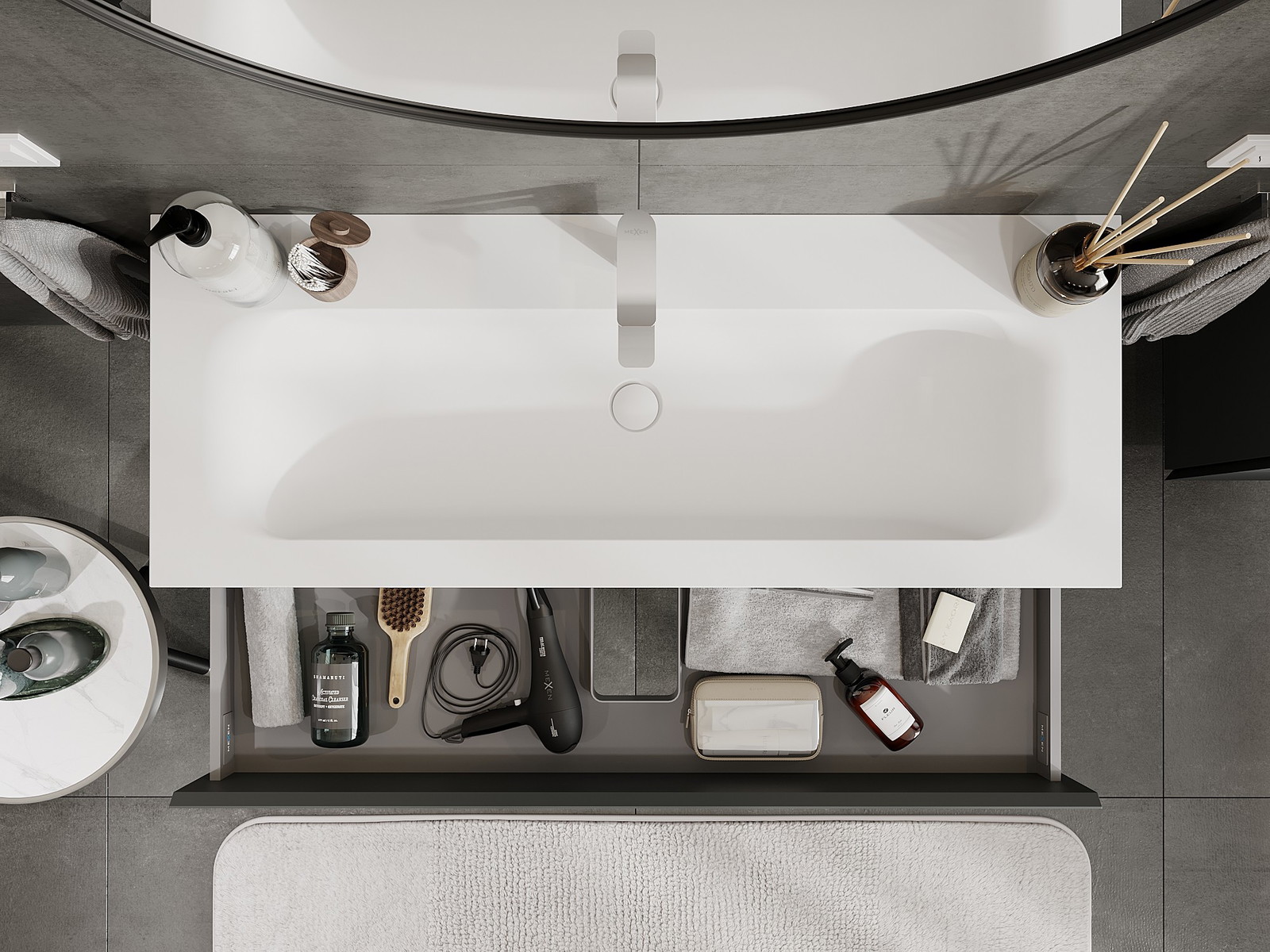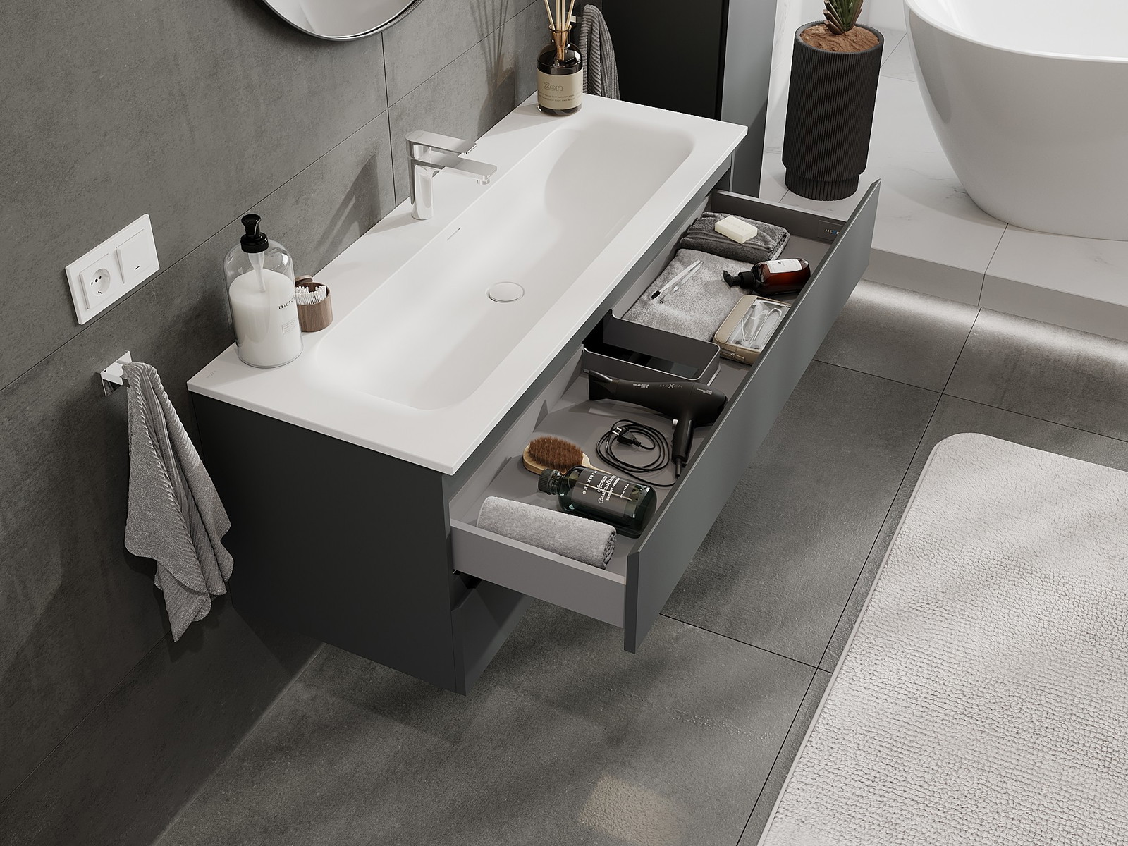 Výřez v zásuvce je navržen tak, aby pojmul sifon, který je nezbytný v instalacích umyvadlových. Díky tomu může být nábytek plně funkčně namontován, aniž by bylo nutné vzdát se prostoru v zásuvce ve prospěch instalace.