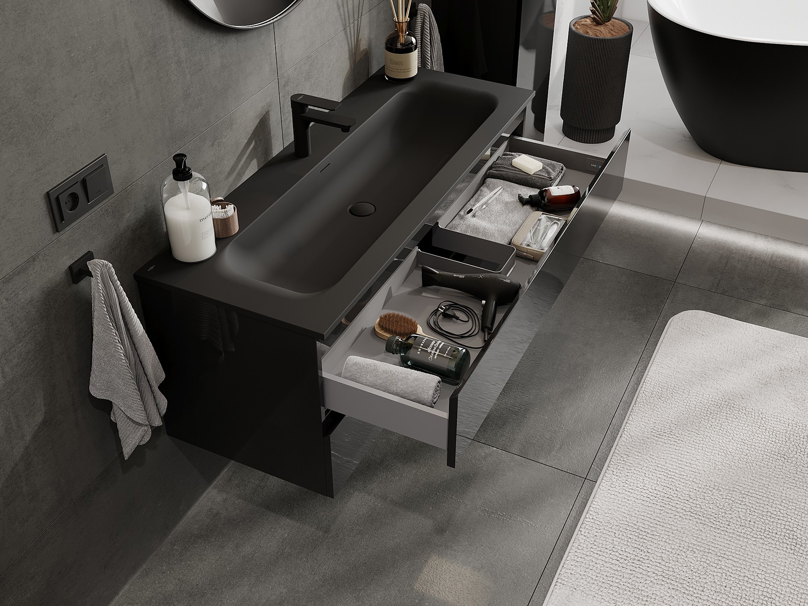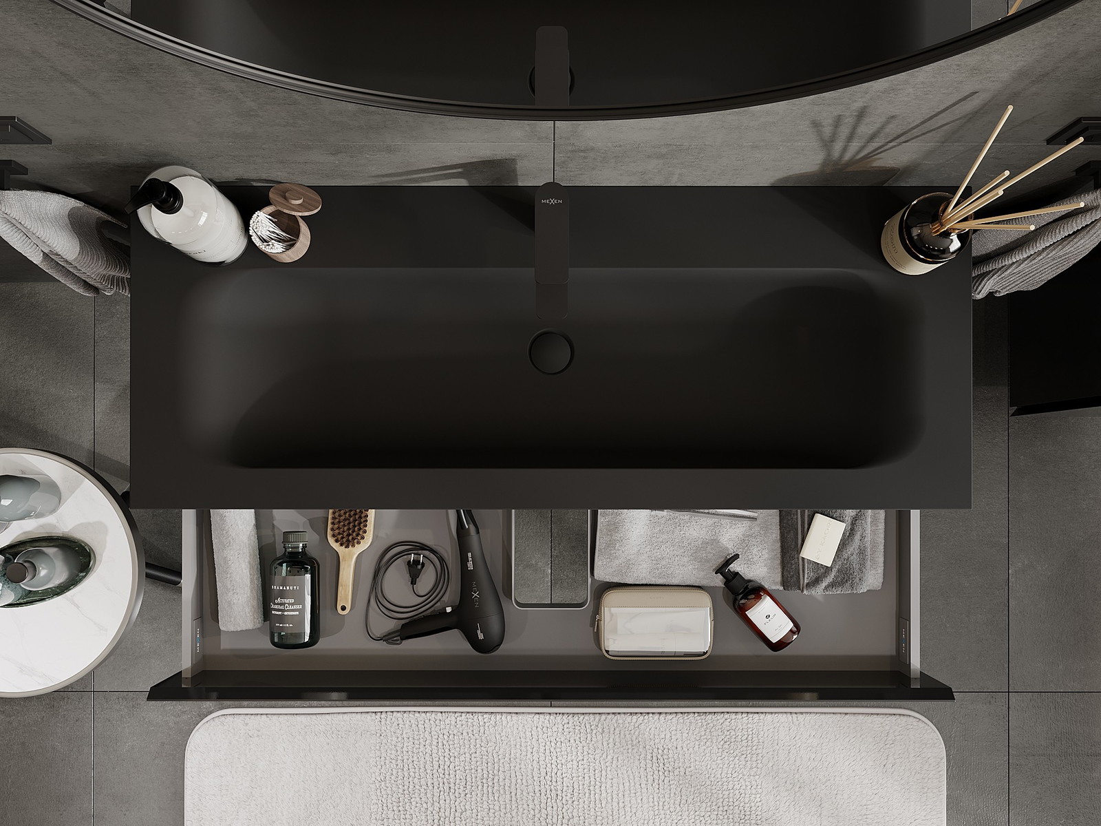 Výřez v zásuvce je navržen tak, aby pojmul sifon, který je nezbytný v instalacích umyvadlových. Díky tomu může být nábytek plně funkčně namontován, aniž by bylo nutné vzdát se prostoru v zásuvce ve prospěch instalace.