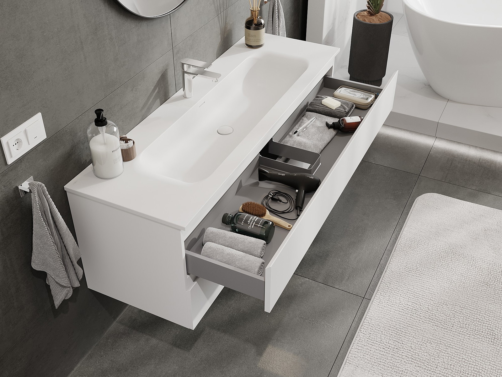 Výřez v zásuvce je navržen tak, aby pojmul sifon, který je nezbytný v instalacích umyvadlových. Díky tomu může být nábytek plně funkčně namontován, aniž by bylo nutné vzdát se prostoru v zásuvce ve prospěch instalace.