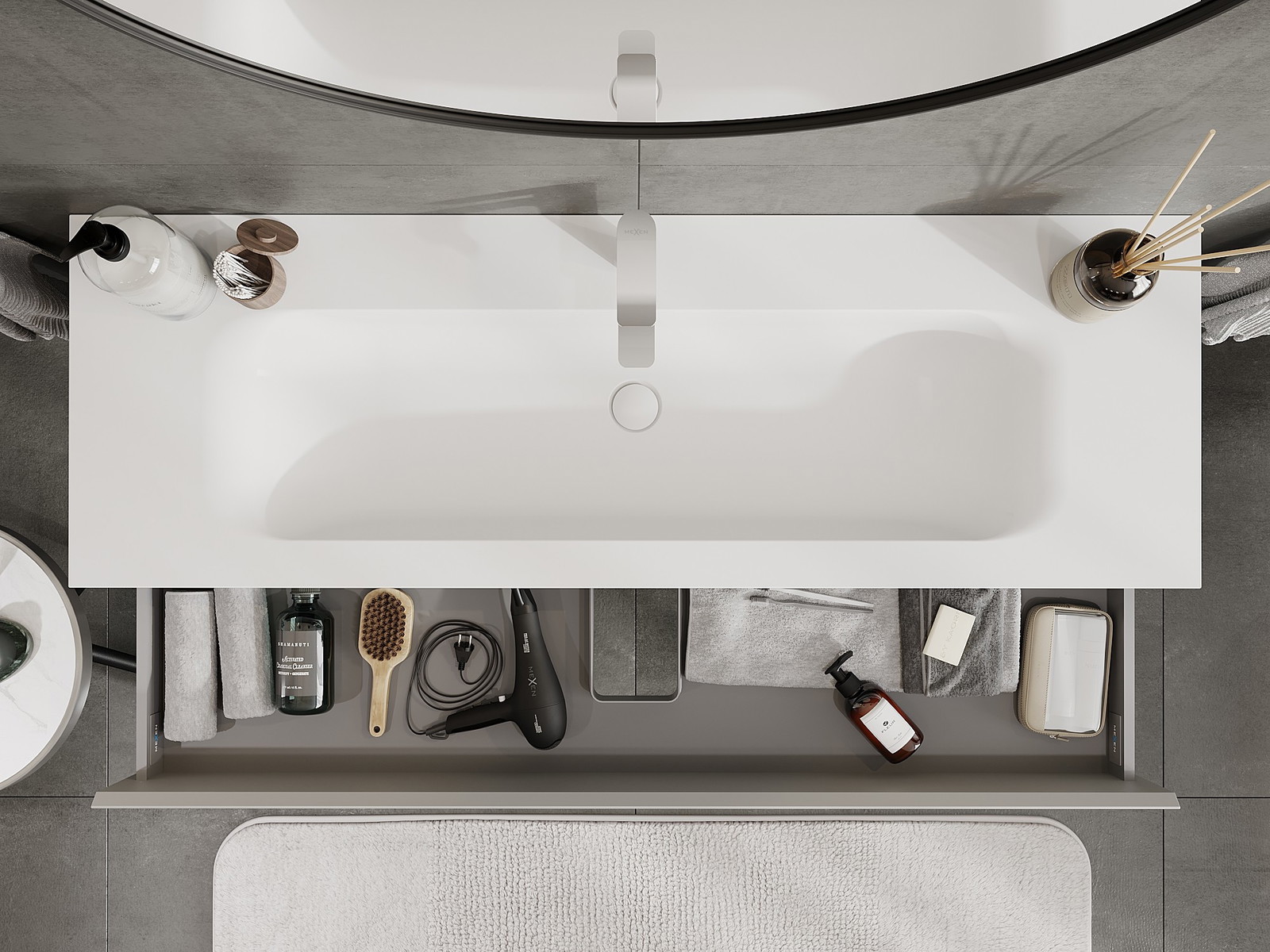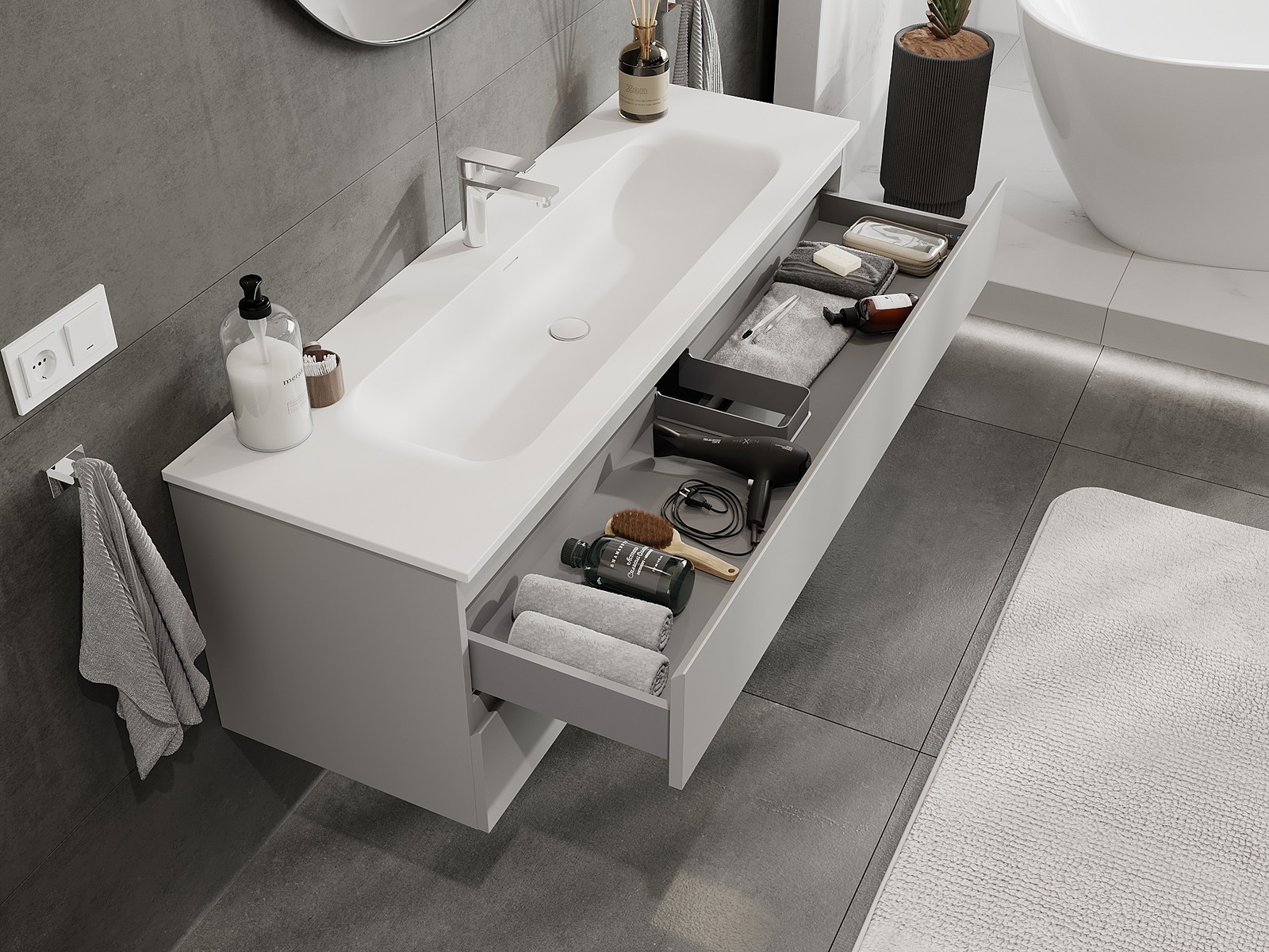 Výřez v zásuvce je navržen tak, aby pojmul sifon, který je nezbytný v instalacích umyvadlových. Díky tomu může být nábytek plně funkčně namontován, aniž by bylo nutné vzdát se prostoru v zásuvce ve prospěch instalace.