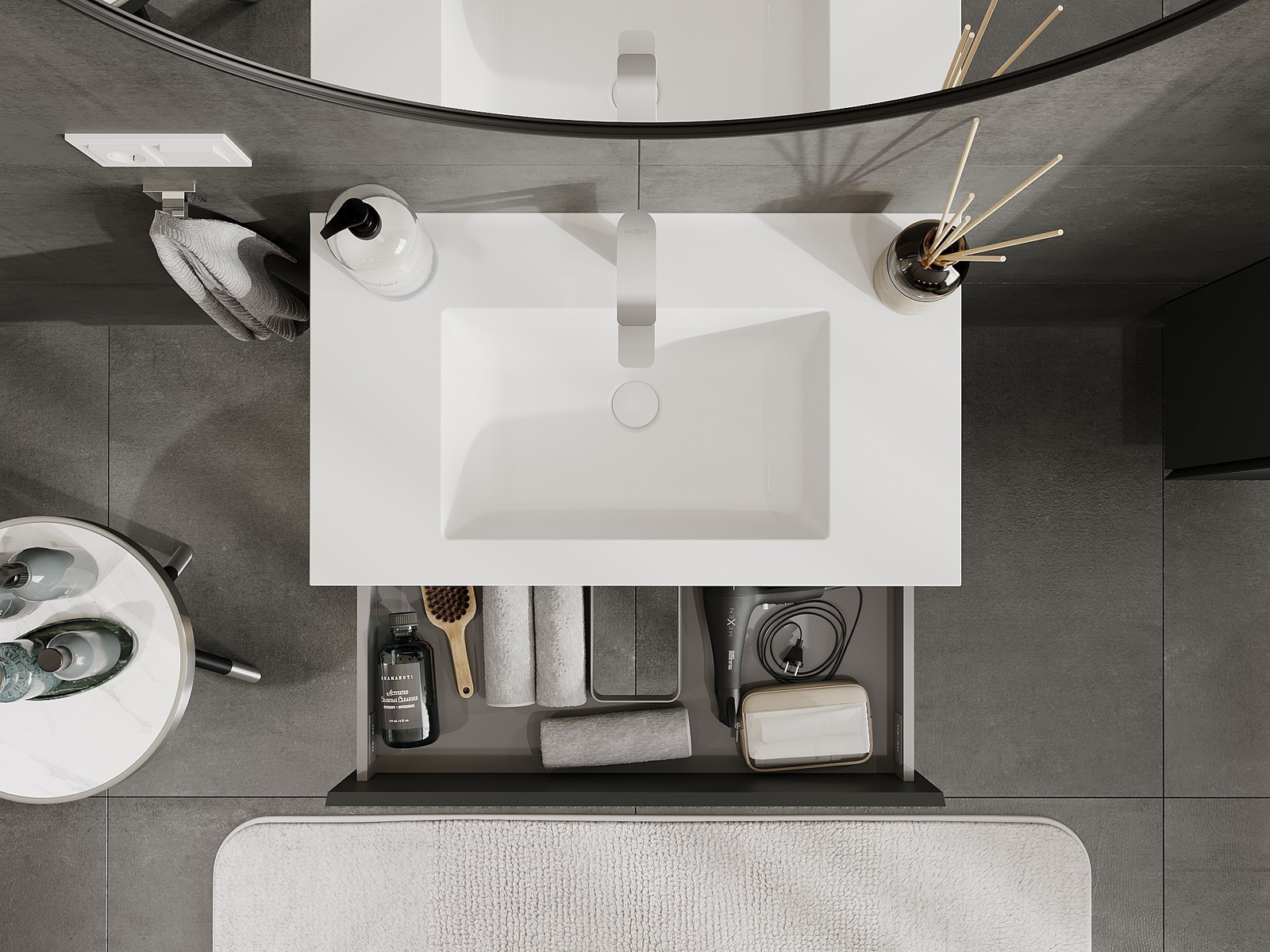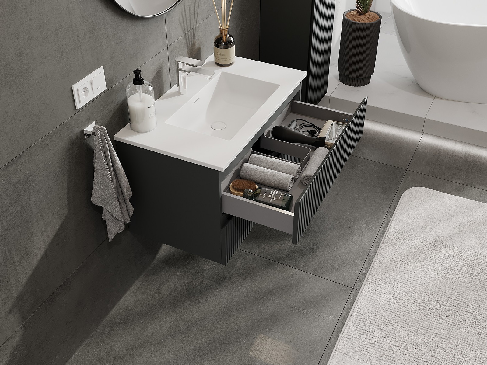 Výřez v zásuvce je navržen tak, aby pojmul sifon, který je nezbytný v instalacích umyvadlových. Díky tomu může být nábytek plně funkčně namontován, aniž by bylo nutné vzdát se prostoru v zásuvce ve prospěch instalace.