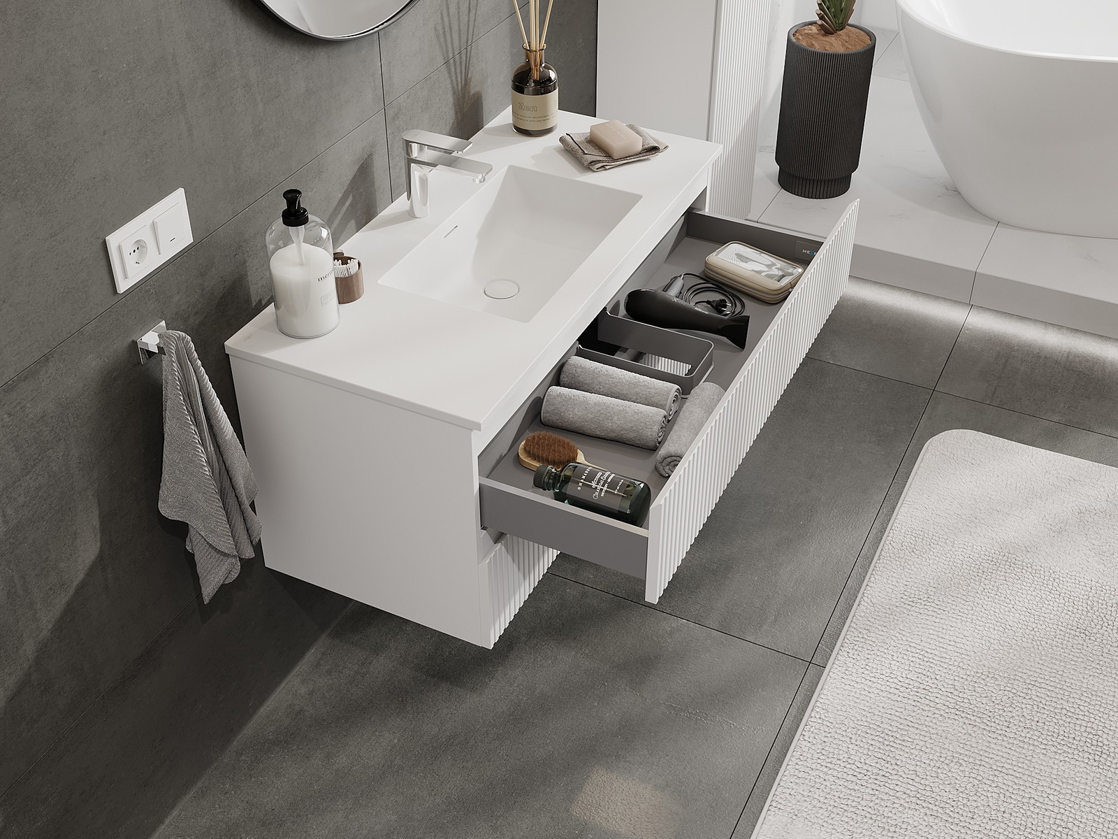 Výřez v zásuvce je navržen tak, aby pojmul sifon, který je nezbytný v instalacích umyvadlových. Díky tomu může být nábytek plně funkčně namontován, aniž by bylo nutné vzdát se prostoru v zásuvce ve prospěch instalace.