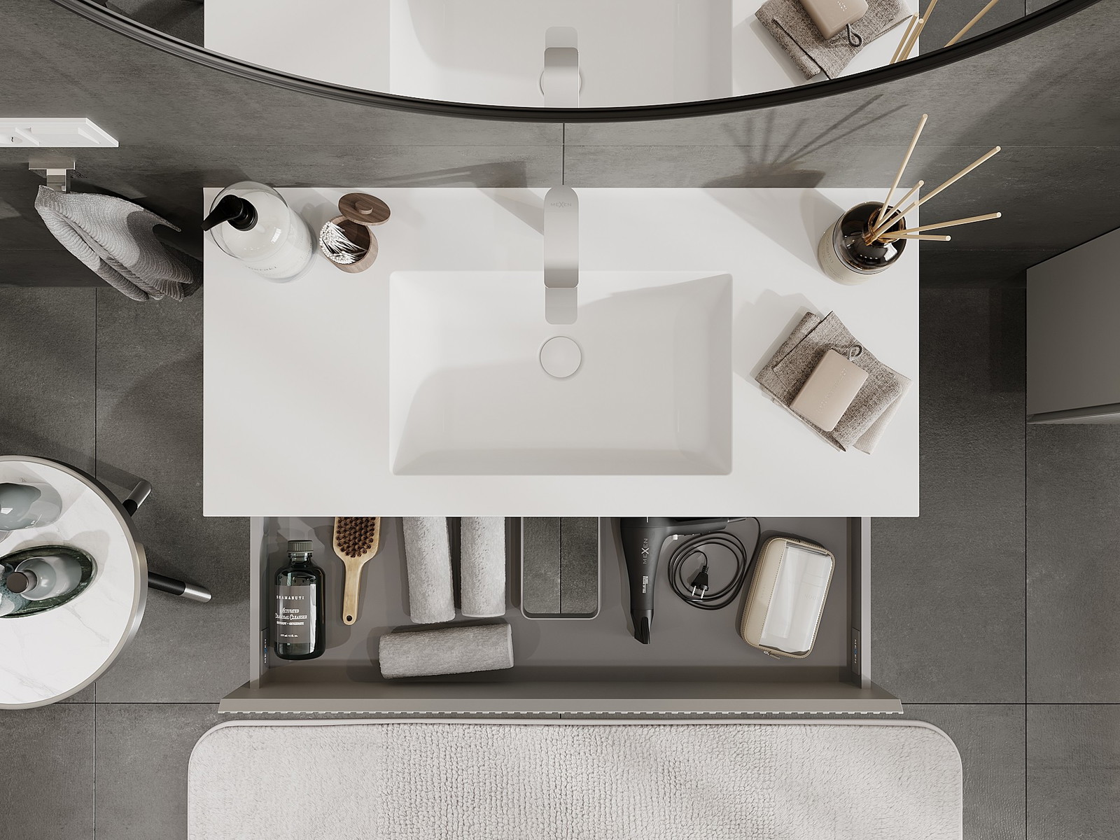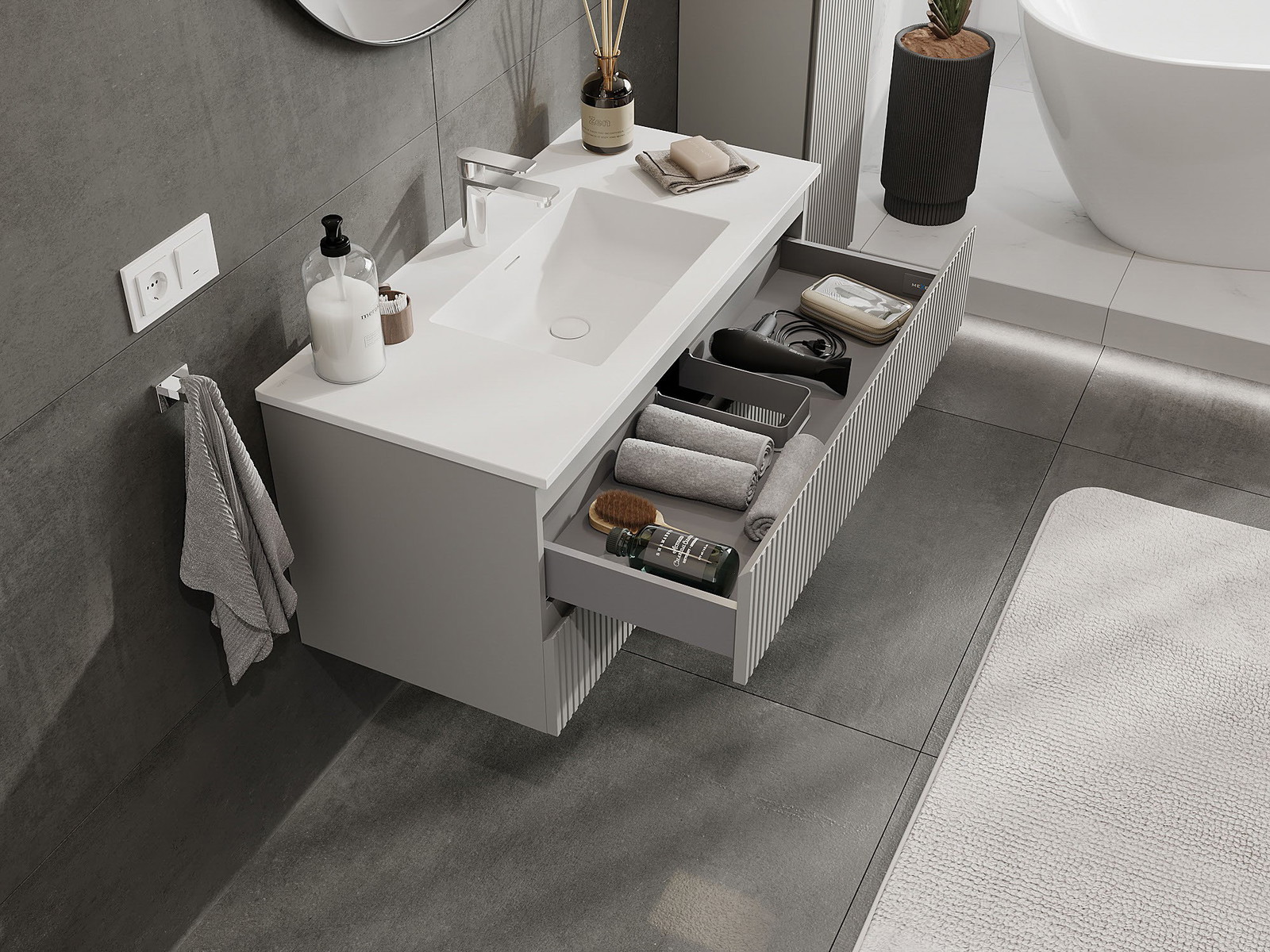 Výřez v zásuvce je navržen tak, aby pojmul sifon, který je nezbytný v instalacích umyvadlových. Díky tomu může být nábytek plně funkčně namontován, aniž by bylo nutné vzdát se prostoru v zásuvce ve prospěch instalace.