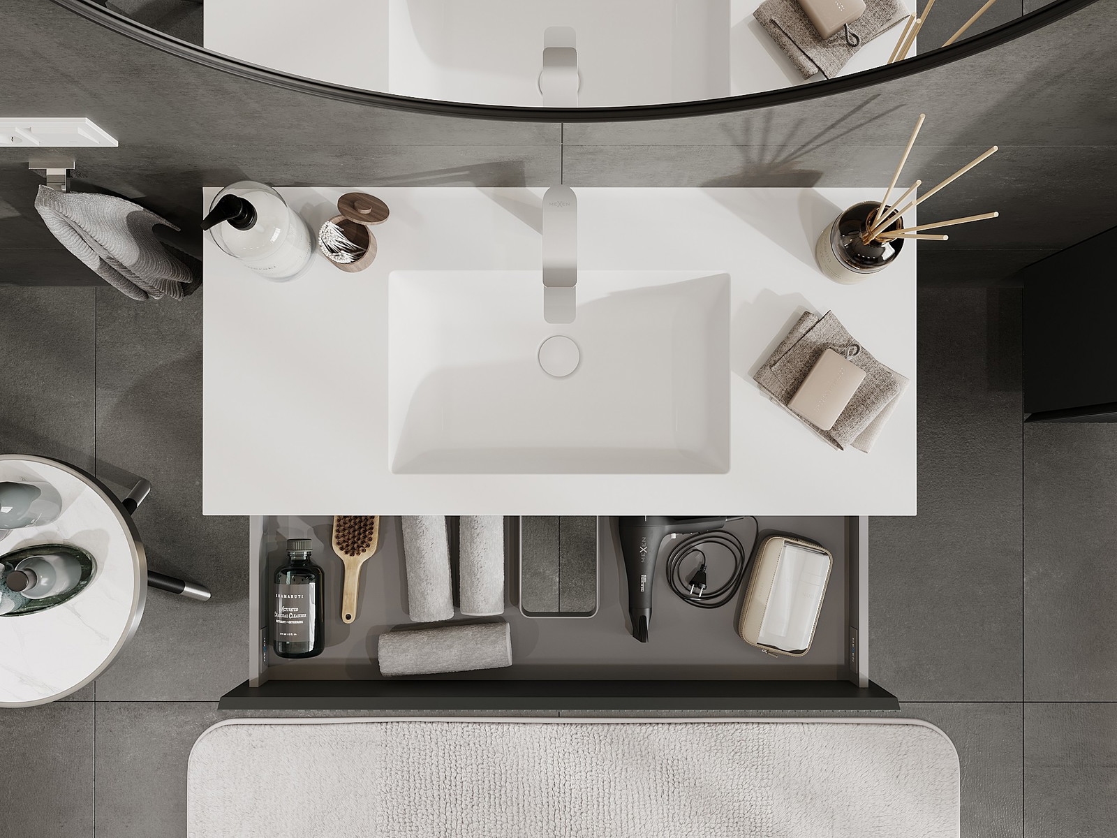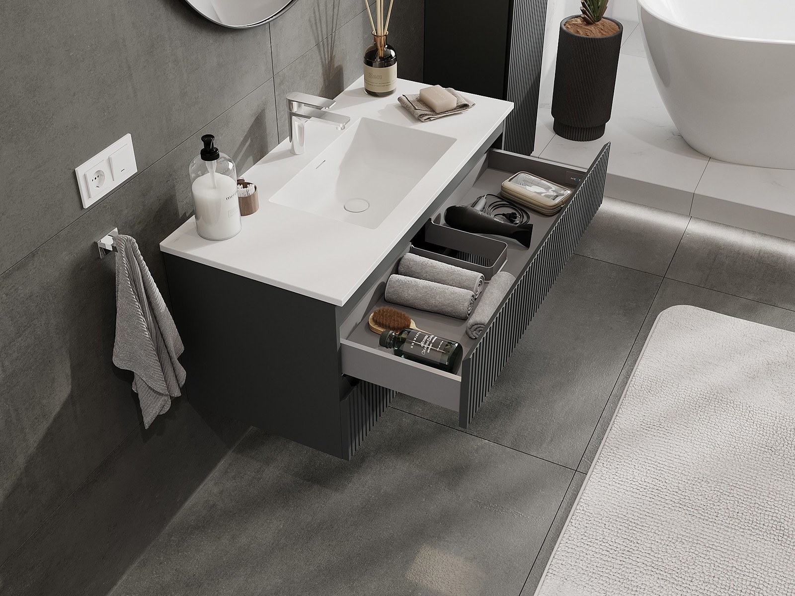 Výřez v zásuvce je navržen tak, aby pojmul sifon, který je nezbytný v instalacích umyvadlových. Díky tomu může být nábytek plně funkčně namontován, aniž by bylo nutné vzdát se prostoru v zásuvce ve prospěch instalace.