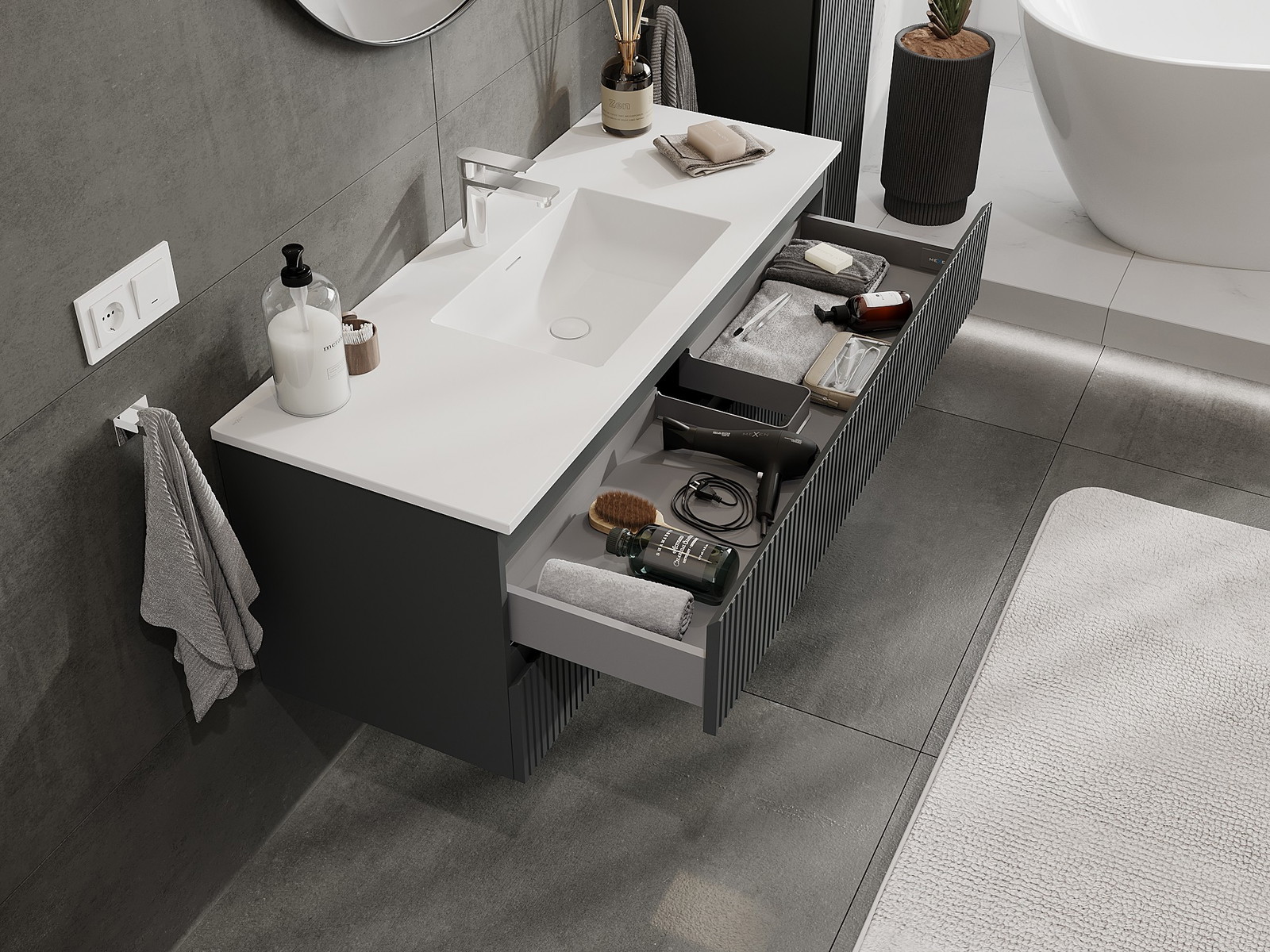 Výřez v zásuvce je navržen tak, aby pojmul sifon, který je nezbytný v instalacích umyvadlových. Díky tomu může být nábytek plně funkčně namontován, aniž by bylo nutné vzdát se prostoru v zásuvce ve prospěch instalace.