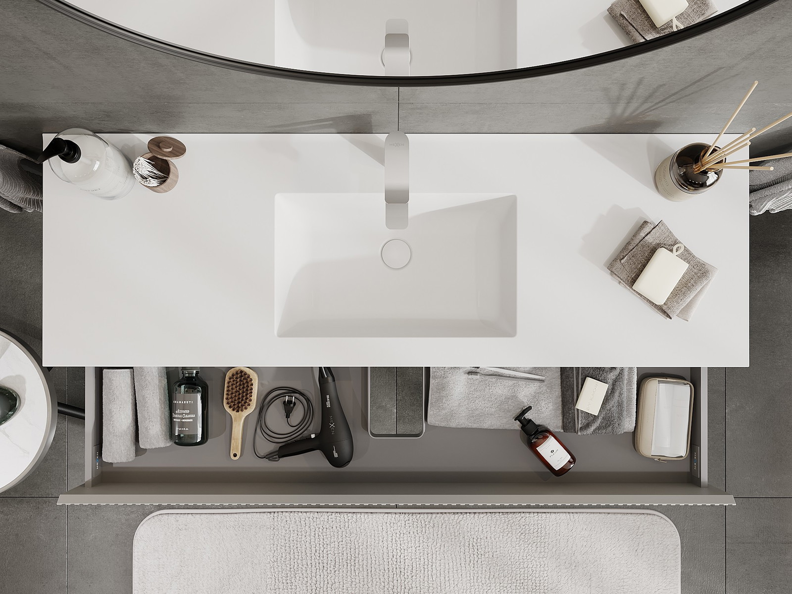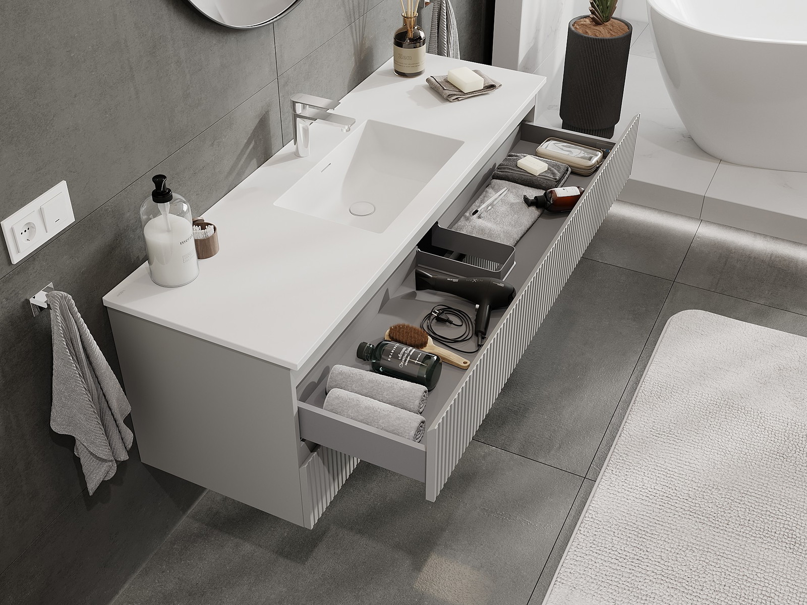 Výřez v zásuvce je navržen tak, aby pojmul sifon, který je nezbytný v instalacích umyvadlových. Díky tomu může být nábytek plně funkčně namontován, aniž by bylo nutné vzdát se prostoru v zásuvce ve prospěch instalace.