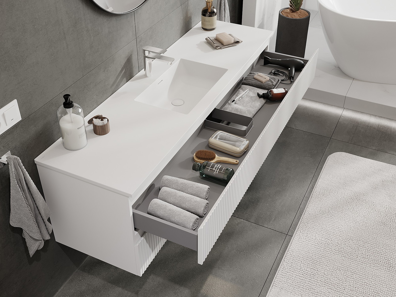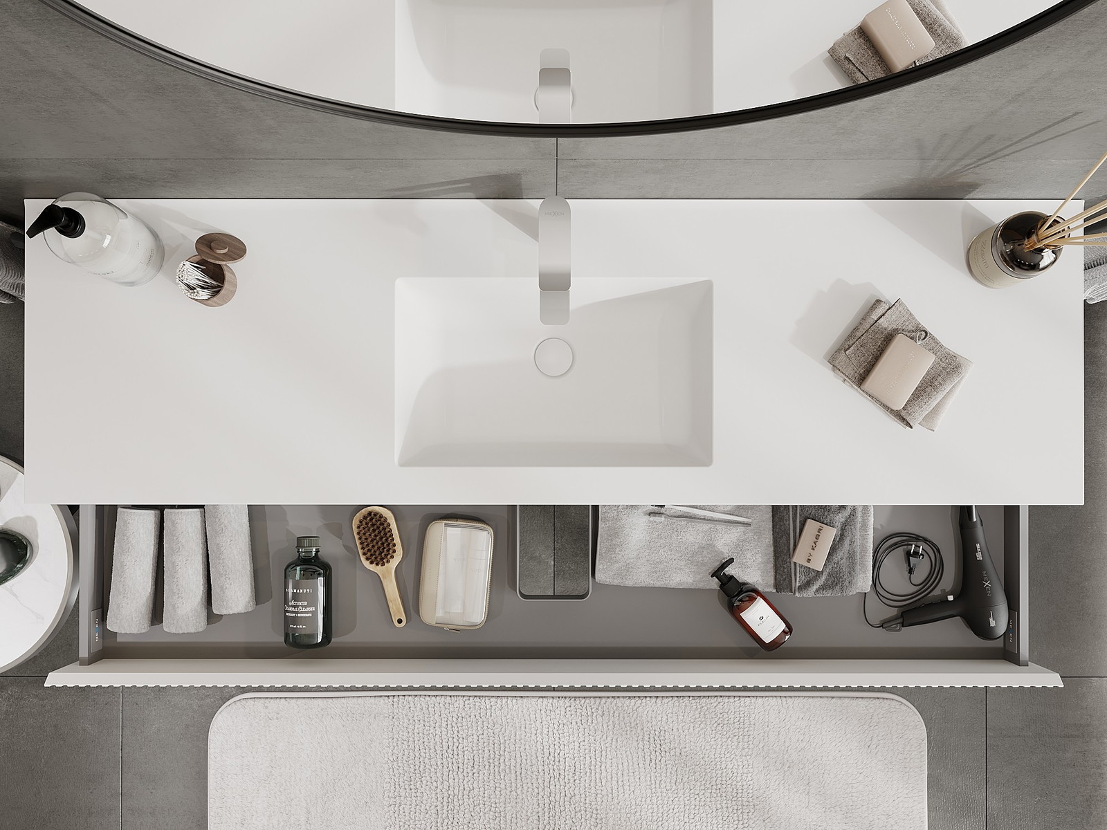 Výřez v zásuvce je navržen tak, aby pojmul sifon, který je nezbytný v instalacích umyvadlových. Díky tomu může být nábytek plně funkčně namontován, aniž by bylo nutné vzdát se prostoru v zásuvce ve prospěch instalace.