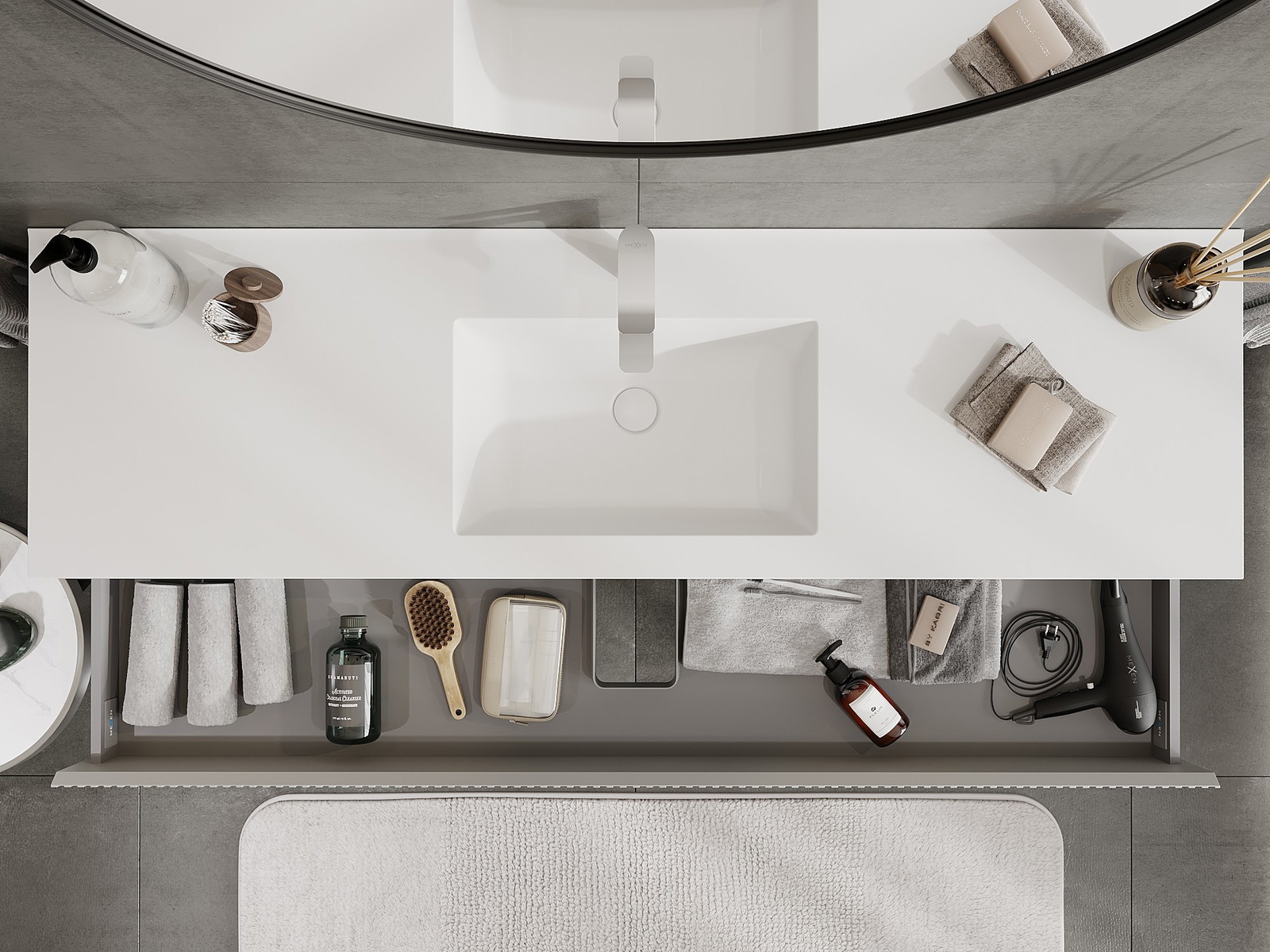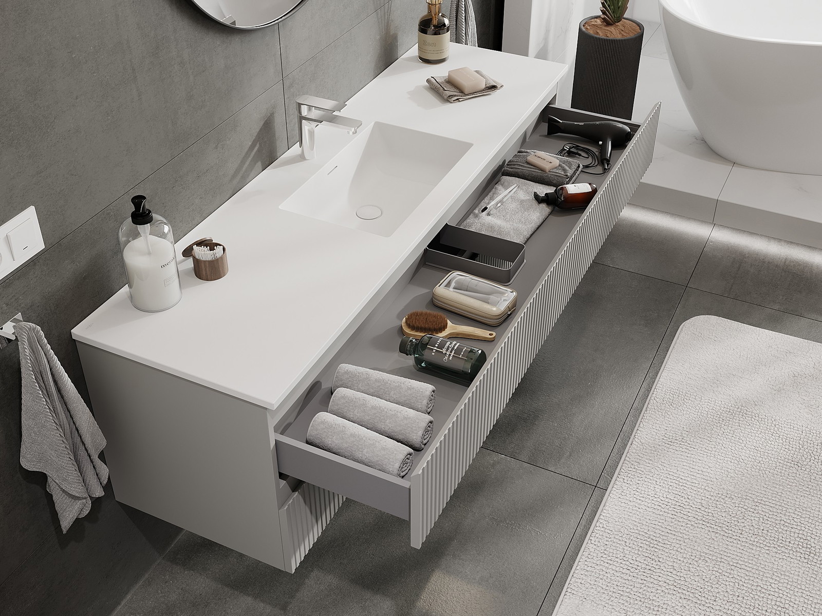 Výřez v zásuvce je navržen tak, aby pojmul sifon, který je nezbytný v instalacích umyvadlových. Díky tomu může být nábytek plně funkčně namontován, aniž by bylo nutné vzdát se prostoru v zásuvce ve prospěch instalace.