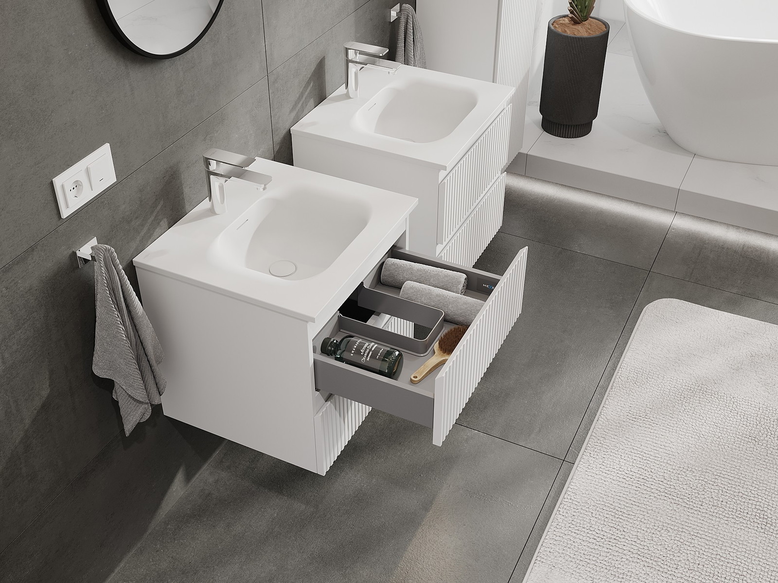 Výřez v zásuvce je navržen tak, aby pojmul sifon, který je nezbytný v instalacích umyvadlových. Díky tomu může být nábytek plně funkčně namontován, aniž by bylo nutné vzdát se prostoru v zásuvce ve prospěch instalace.
