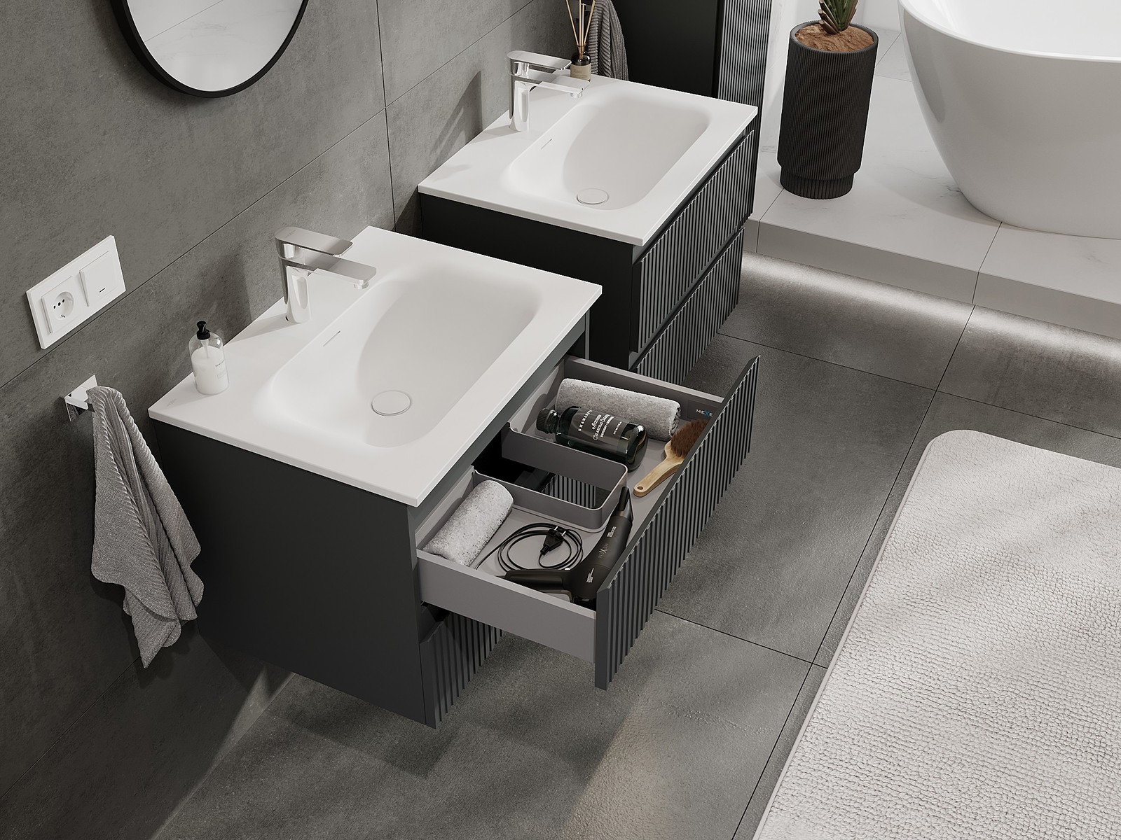 Výřez v zásuvce je navržen tak, aby pojmul sifon, který je nezbytný v instalacích umyvadlových. Díky tomu může být nábytek plně funkčně namontován, aniž by bylo nutné vzdát se prostoru v zásuvce ve prospěch instalace.