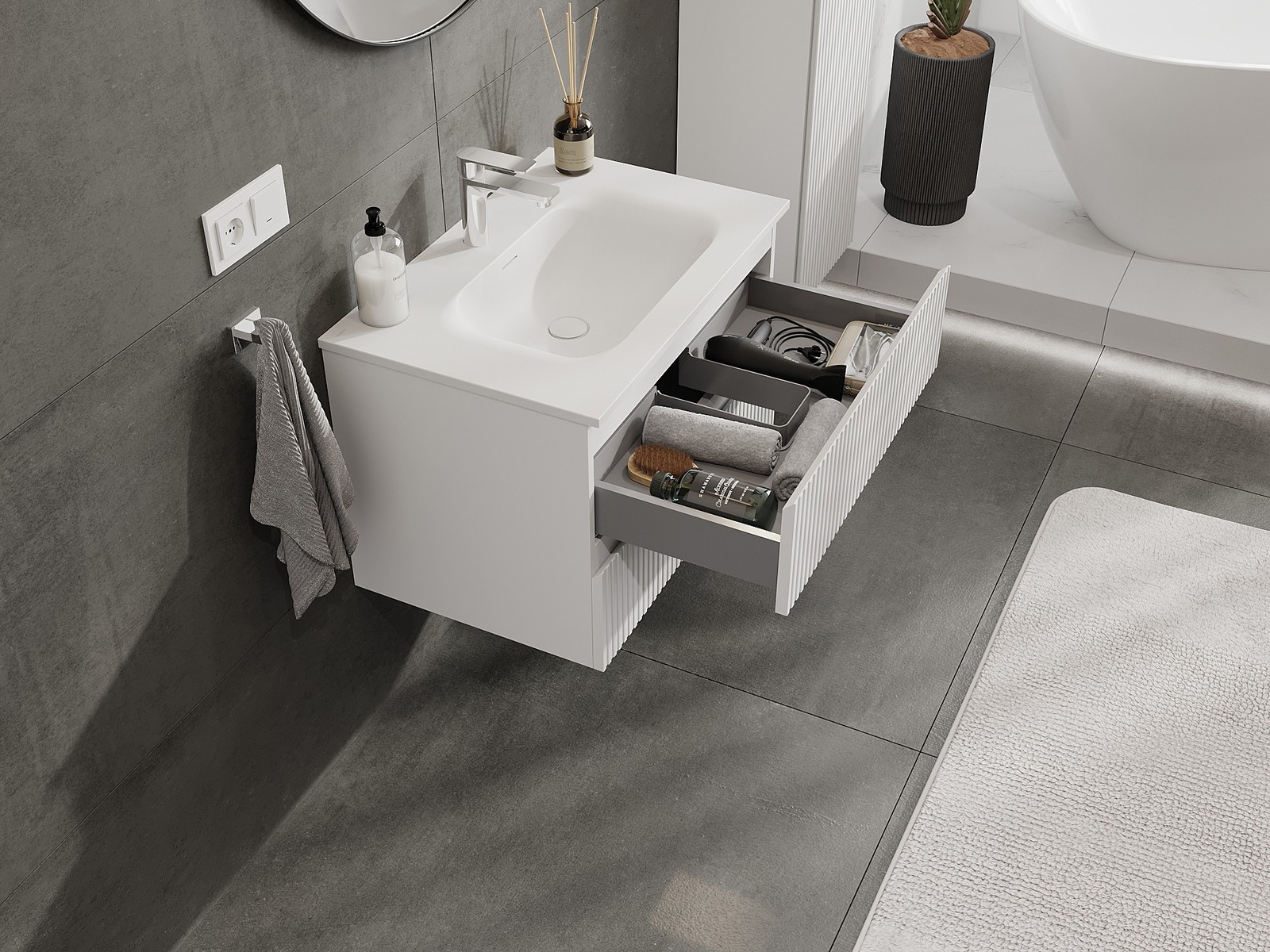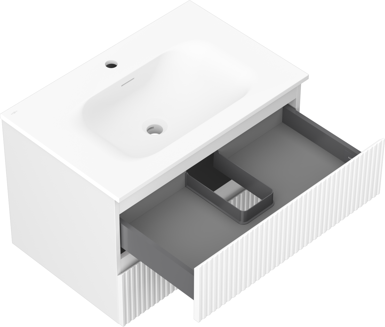 Výřez v zásuvce je navržen tak, aby pojmul sifon, který je nezbytný v instalacích umyvadlových. Díky tomu může být nábytek plně funkčně namontován, aniž by bylo nutné vzdát se prostoru v zásuvce ve prospěch instalace.