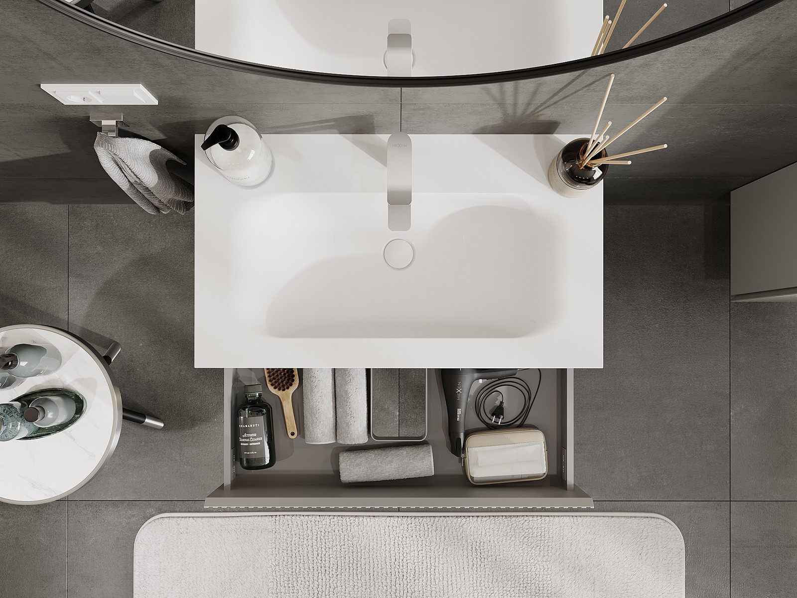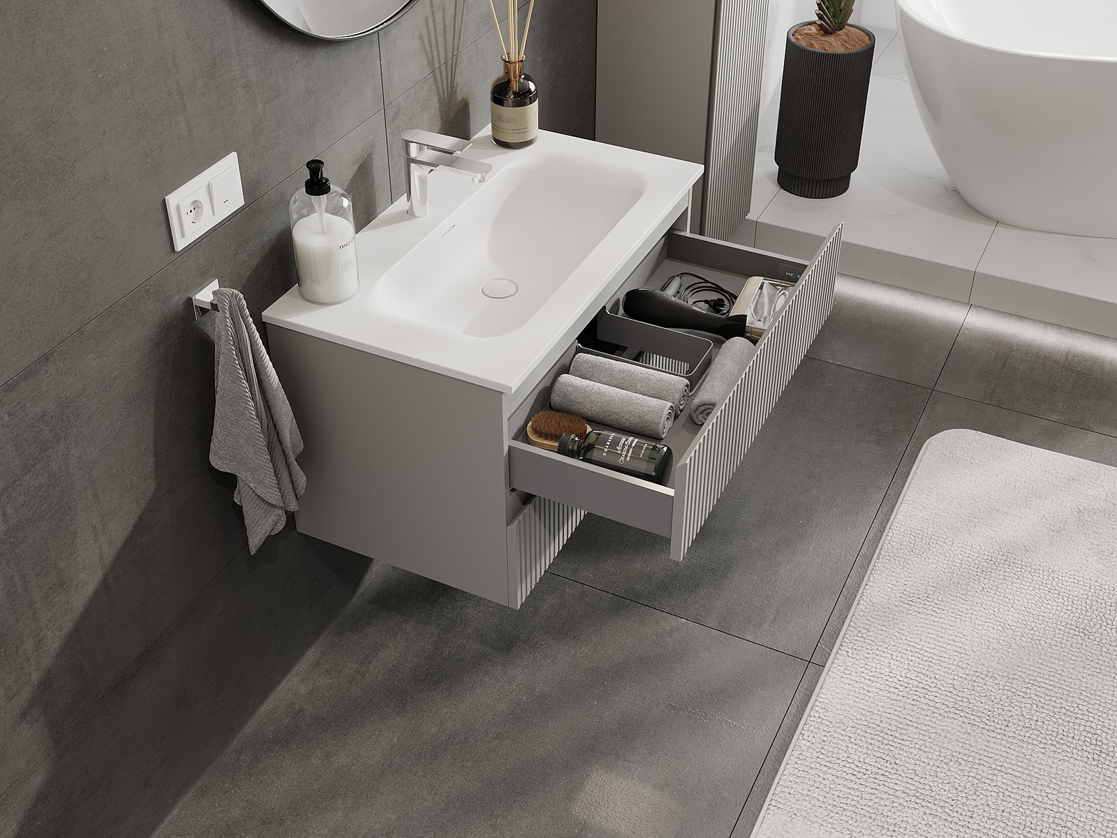 Výřez v zásuvce je navržen tak, aby pojmul sifon, který je nezbytný v instalacích umyvadlových. Díky tomu může být nábytek plně funkčně namontován, aniž by bylo nutné vzdát se prostoru v zásuvce ve prospěch instalace.