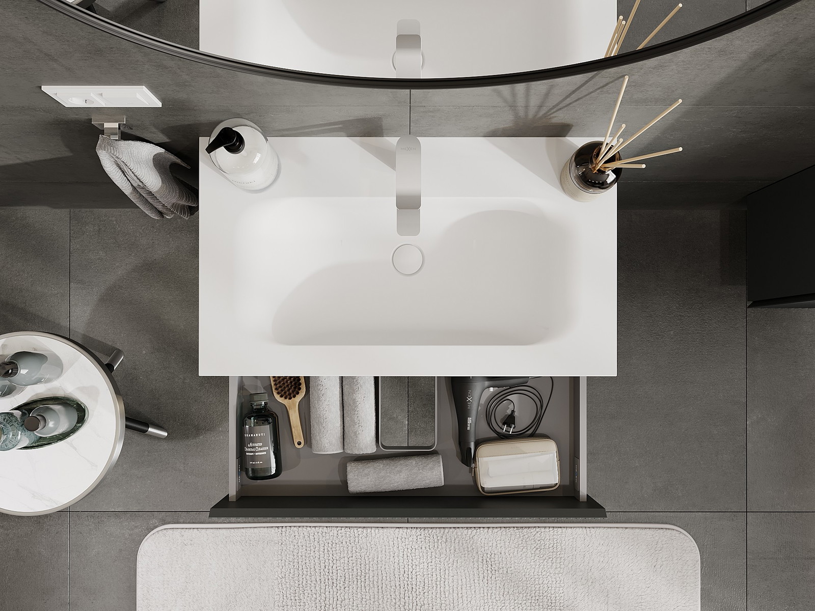 Výřez v zásuvce je navržen tak, aby pojmul sifon, který je nezbytný v instalacích umyvadlových. Díky tomu může být nábytek plně funkčně namontován, aniž by bylo nutné vzdát se prostoru v zásuvce ve prospěch instalace.